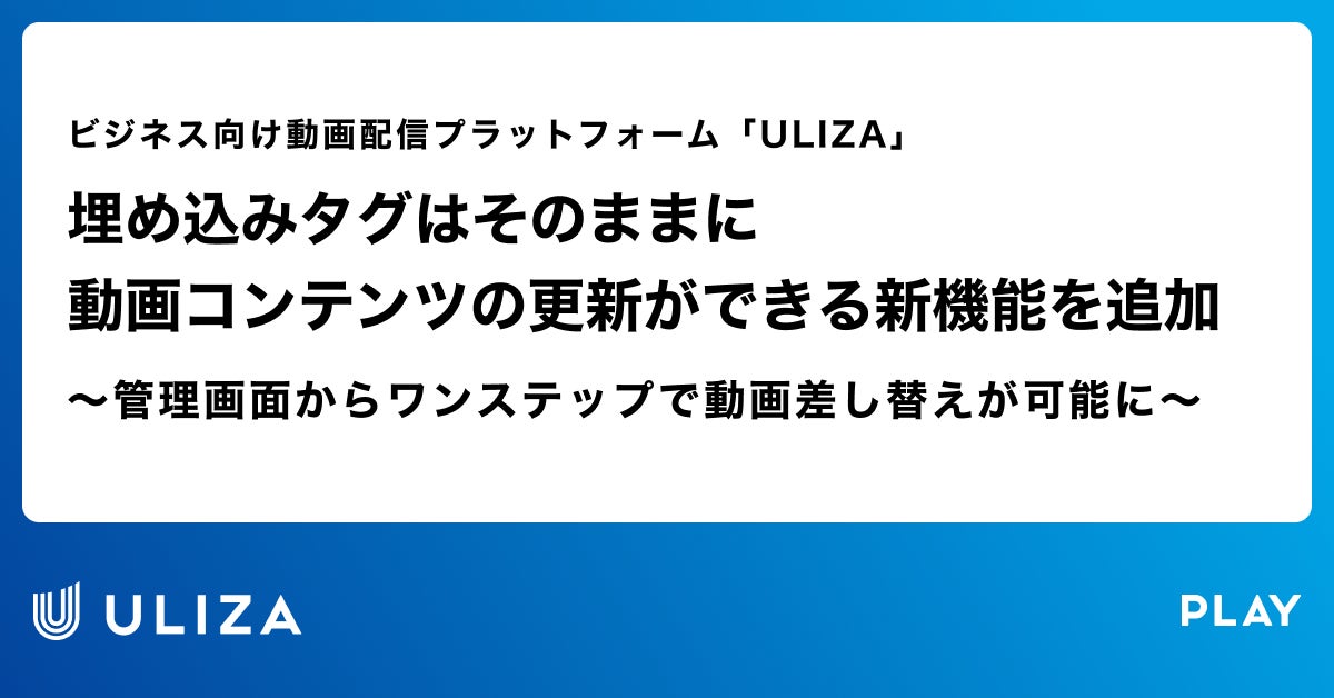 法人向け動画配信プラットフォーム「ULIZA(ウリザ)」を提供している株式会社PLAY(本社:東京都渋谷区、代表取締役社長:黒田和道)は、サイト内等に埋め込んだタグを差し替えることなく、管理画面上で動画を更新・アップロードするだけで、コンテンツの差し替えが完了できる新機能をリリースしたことをお知らせします。