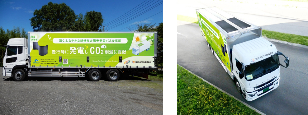 2025年5月より、東洋メビウスの物流用トラックの屋根に、「MiraNeo🄬」製品を適用した太陽光発電パネルを積載し、走行・発電することによるGHG削減効果の検証を開始予定です。また、2025年6月を目処として、実証実験中である旨をラッピングしたトラックの走行も開始します。