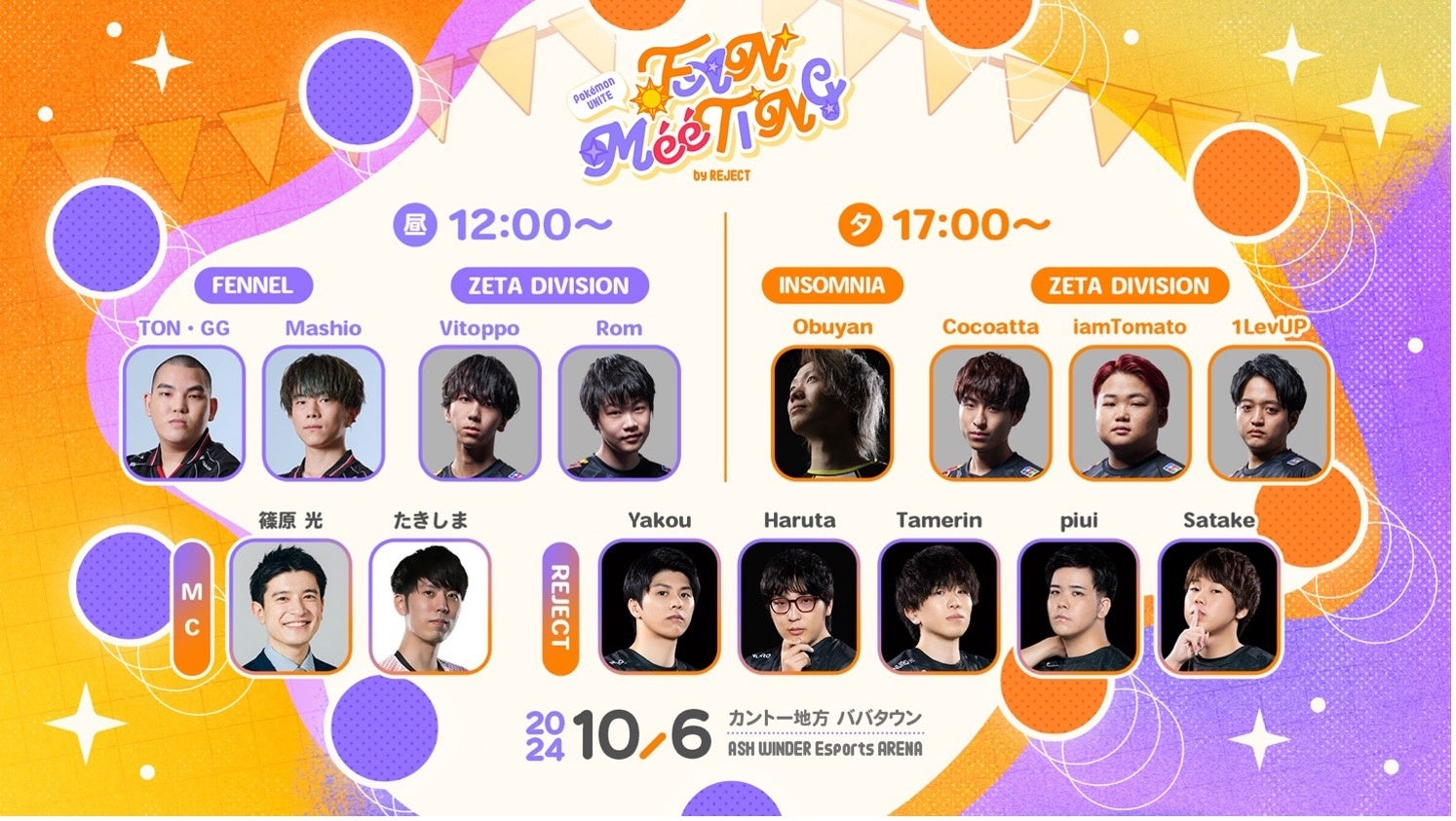「Pokémon UNITE FAN MééTING by REJECT 」では、REJECTの選手のみならず、ZETA DIVISION・FENNEL・INSOMNIAに所属する選手もゲスト参加し、ファンの方々がプロ選手と楽しむことのできる多彩なプログラムをご用意しておりますので、ご期待ください。