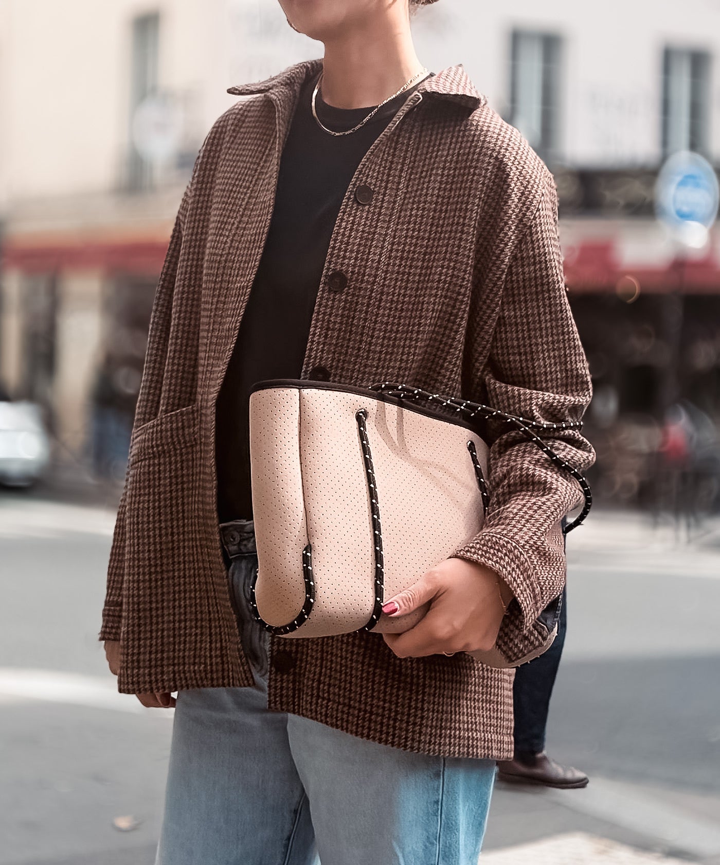 このサンドベージュは、何度も試作と染め直しを重ねてようやく完成したこだわりの色。ミルフィーユのように薄い層が重なるネオプレーン素材の特性を活かし、ベース層にブラックを採用。その上にベージュを重ねることで、深みと落ち着きを併せ持つ上品なくすみカラーに仕上がりました。