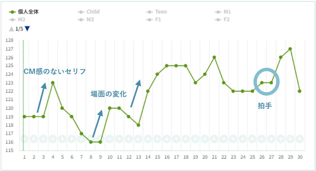 【26秒目~】拍手の効果音を挿入。音声はナレーションや会話が主であったため、聴覚に違和感を覚えやすかったのか、CM最終盤に注視が最高となった。また、この最適なタイミングでサウンドロゴを挿入することができていた。