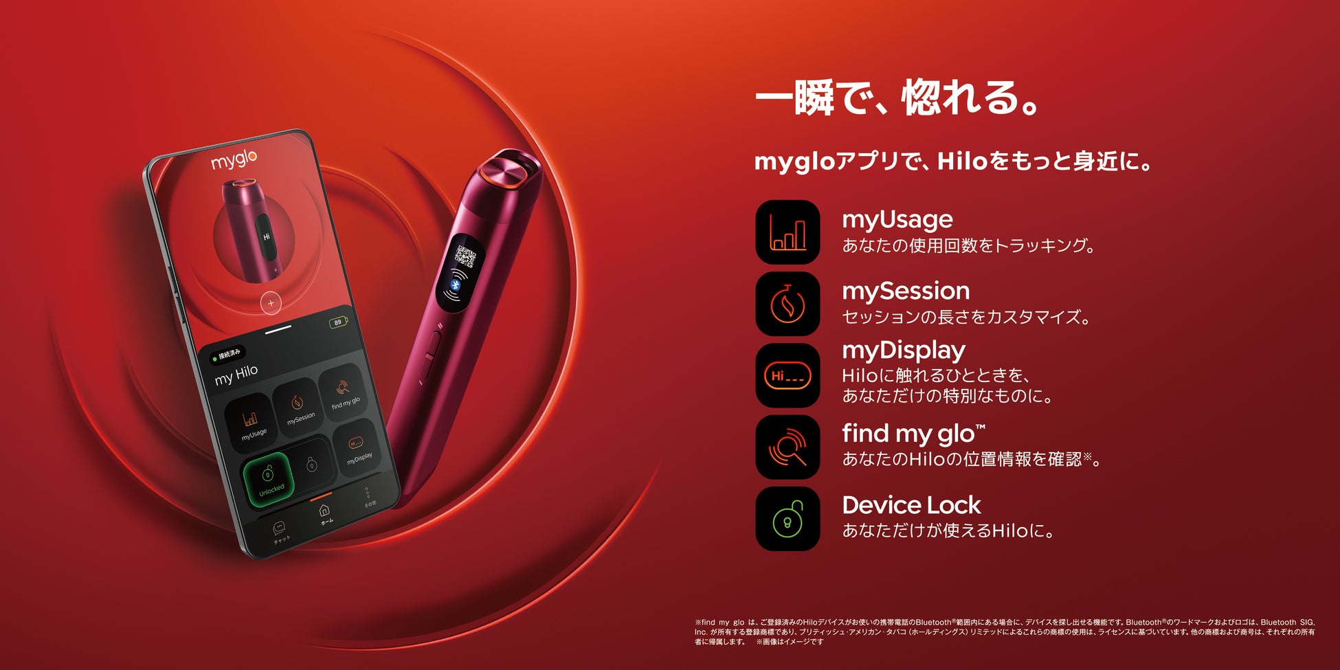 [5] find my gloは、ご登録済のHiloデバイスがお使いの携帯電話のBluetooth®の範囲内にある場合に、デバイスを探し出せる機能です。Bluetooth®のワードマーク及びロゴは、Bluetooth SIG, Inc.が所有する商標登録であり、ブリティッシュ・アメリカン・タバコ(ホールディングス)リミテッドによるこれらの商標の使用は、ライセンスに基づいています。他の商標及び商号は、それぞれの所有者に帰属します。