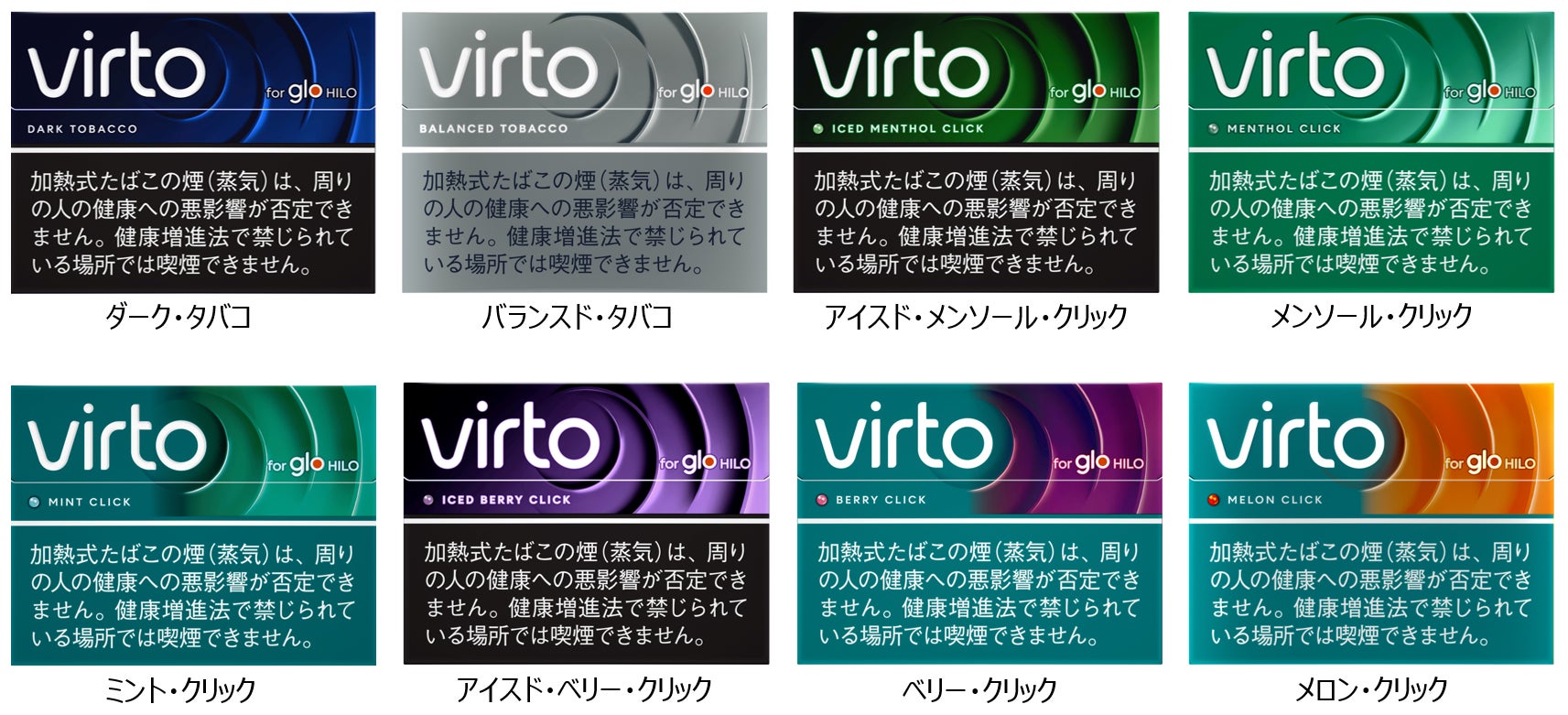 glo™ Hilo専用の新スティックvirto™も発売いたします。virto™のたばこ葉はブレンダーが丁寧に調合し、スティック全体に無駄なく熱が伝わるよう独自に設計された構造により、吸い心地の良さを実現しています。virto™は、レギュラー、メンソール、フレーバーメンソールに分類される全8種類の味わいが用意されており、たばこ葉がデバイスに落ちないStickSeal™テクノロジーも搭載されています。