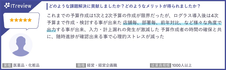 ▽「Loglass 経営管理」のご利用企業様からは、ITreviewにて以下のようなレビューをいただいています。(一部抜粋)