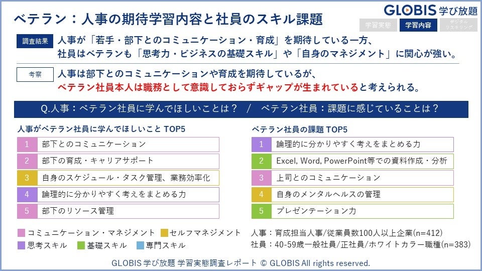 調査では、人事担当者は社員にチームや部下のマネジメントに関することを学んでほしいと思っている一方、社員は自身の業務における基礎スキルや思考スキルへの課題感を高く持っていることがわかりました(図4)。人事担当者と社員の意識にはズレがあることが伺えます。このようなズレは、特に若手/中堅社員、あるいはベテラン社員と人事担当者の間に顕著にみられました(図5)(図6)。