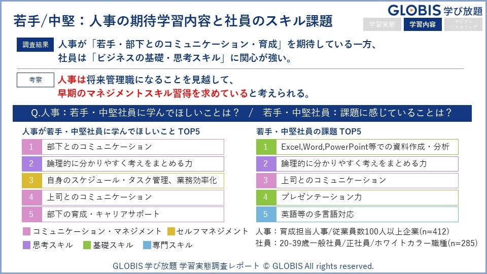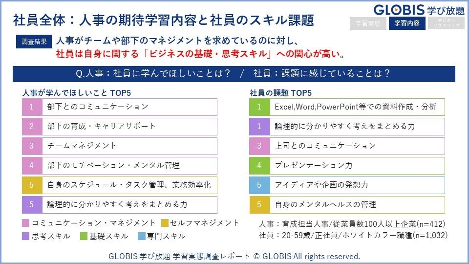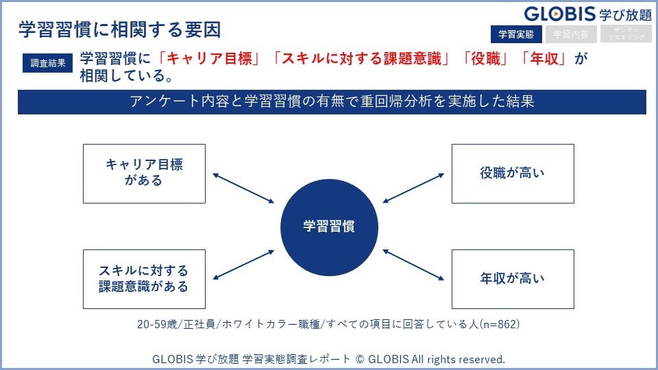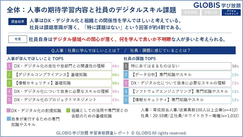 本調査では、インターネット調査により一般の社会人1,032人の他、人事担当者412人の声を集めました。また、GLOBIS 学び放題利用者のデータも併せて用い、リスキリングの傾向を学習状況からも明らかにしました。
