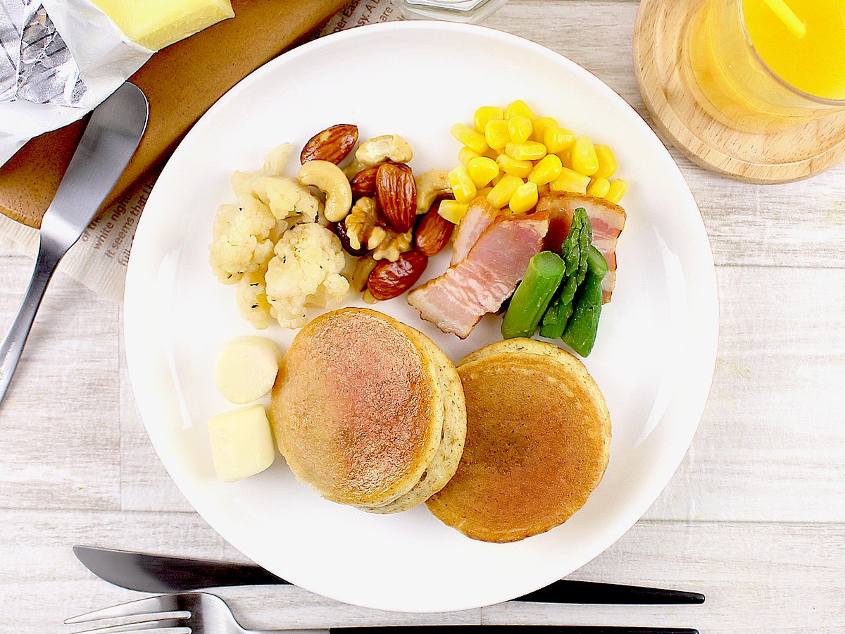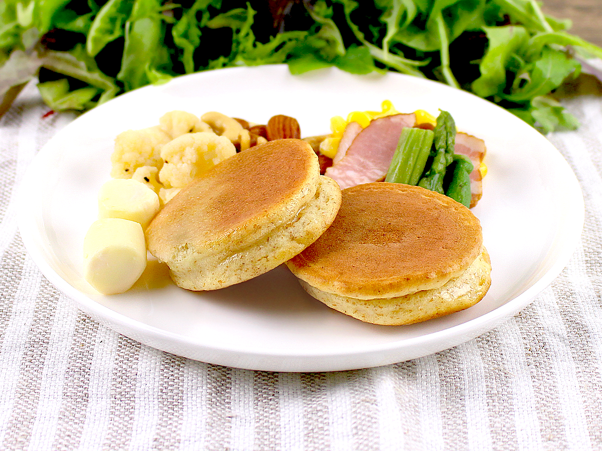 朝食、間食におすすめなパンケーキのプレートです。全粒粉を使用して焼き上げたフワフワのパンケーキにメープルシロップ入りのクリームを挟みました。塩気のある厚切りの燻しベーコンとチーズ、アスパラを添えてありますのでご一緒にお召し上がりください。副菜は黒胡椒香るペッパーカリフラワー、ミックスナッツ、バターコーンです。