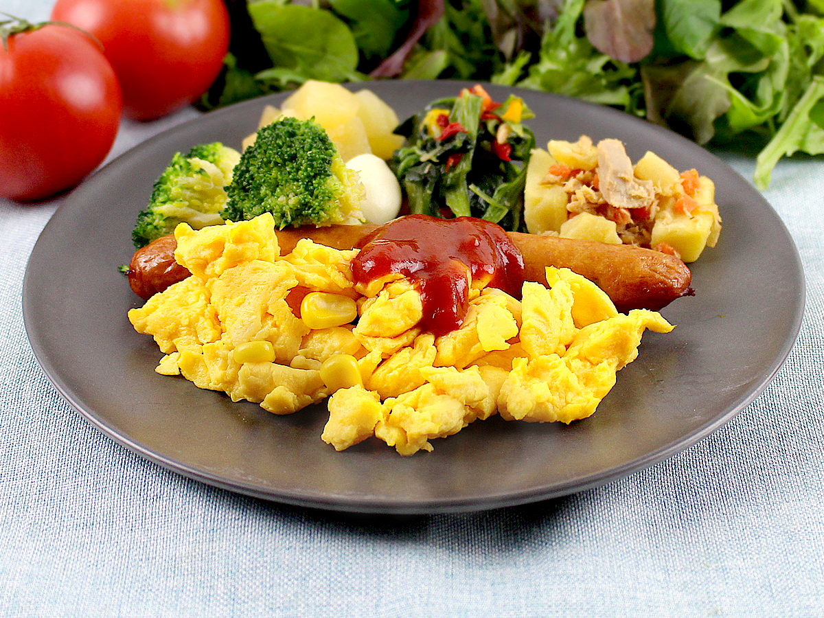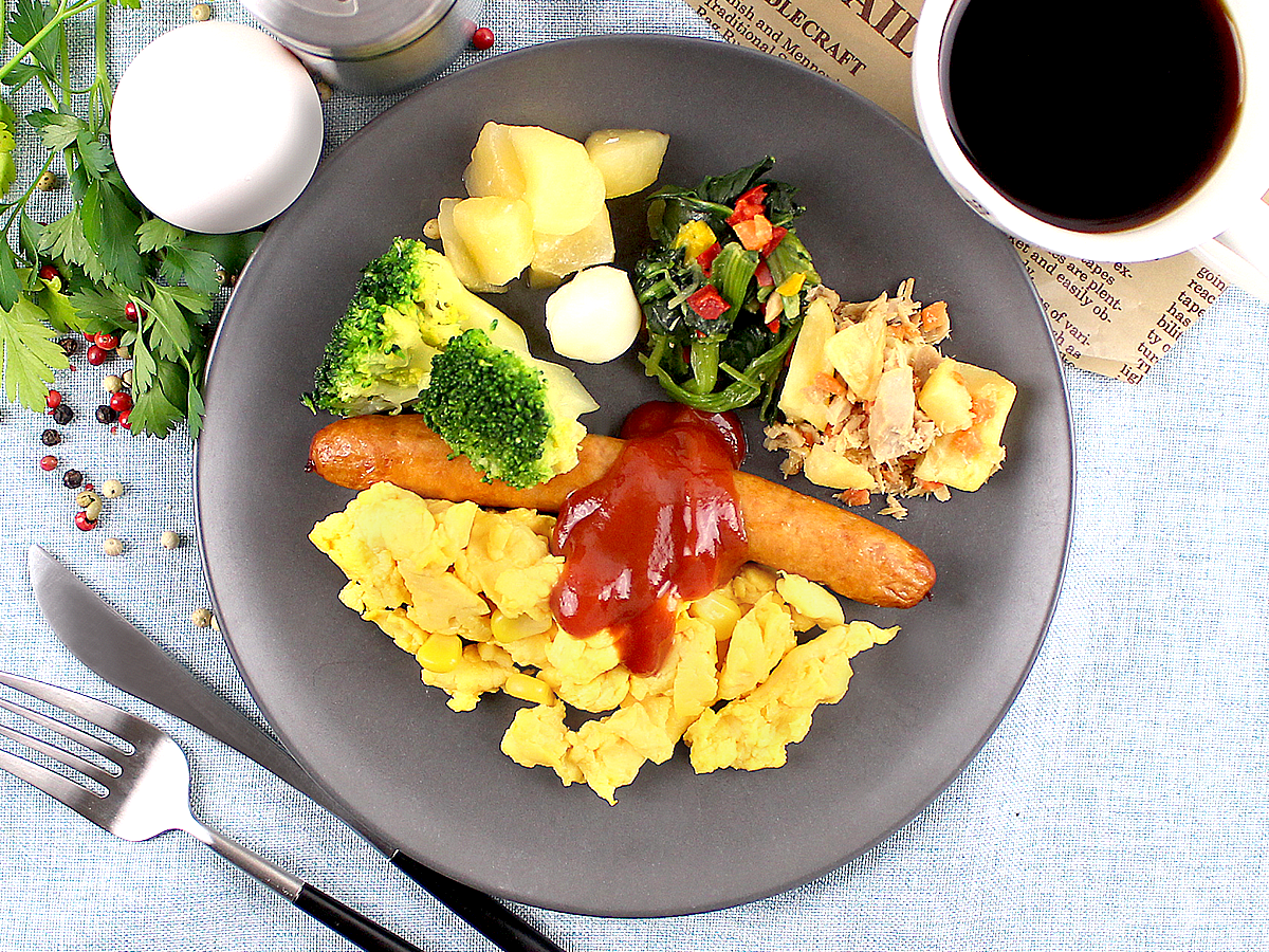 旨味たっぷりの熟成ウインナーとスクランブルエッグをメインプレートでご用意しております。トマトケチャップを添えたウインナーは、ナッシュのパンと併せていただくと、手軽に召し上がっていただける朝食プレートです。副菜は甘酸っぱいリンゴとモッツアレラチーズの塩味が相性抜群なリンゴのコンポートとチーズ、コンソメ味のほうれん草、ほっくりしたじゃがいもが嬉しいポテトグリルのツナあえです。