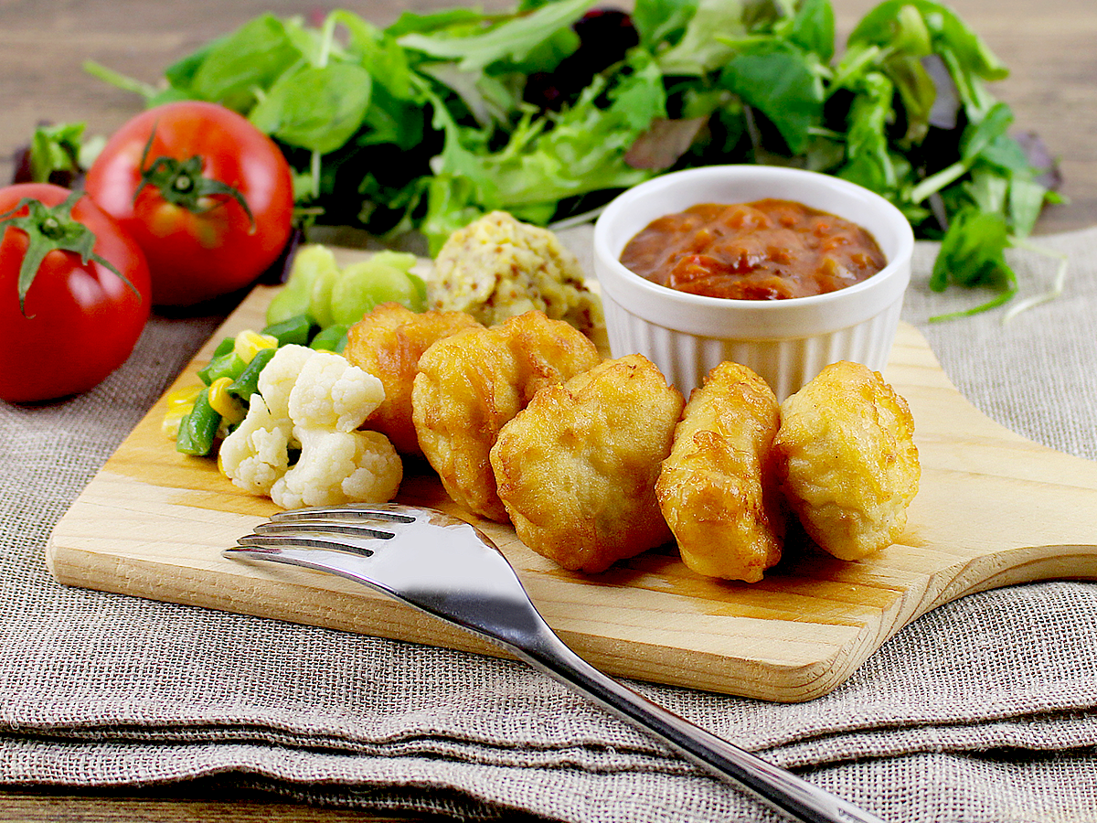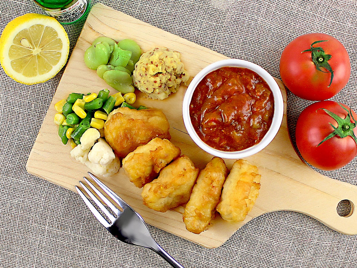 チキンナゲットにカリフラワーとそらまめを合わせた、間食にも朝食にもおすすめの1品です。副菜のポケットには、お肉の旨味がたっぷりのミートソースと粒マスタード入りマッシュポテトをご用意いたしましたので、チキンナゲットとご一緒にお召し上がりいただくと味変ができます。もう一つの副菜はあっさり味付けたコーン、インゲンとパプリカの彩りサラダです。