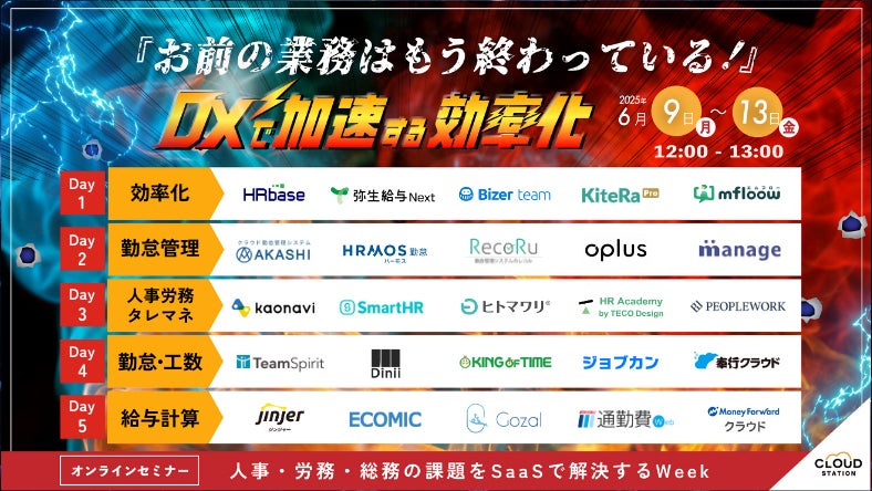 人事労務分野のシステム活用・導入支援を手掛ける株式会社TECO Design(本社:東京都新宿区、代表取締役社長 : 杉野 愼、以下:当社)は、当社が運営するショールーム「CLOUD STATION」に協賛している企業様とHRテックを盛り上げる祭典『お前の業務はもう終わっている!〜DXで加速する効率化〜』を2025年6月9日(月)からの5日間、開催します。