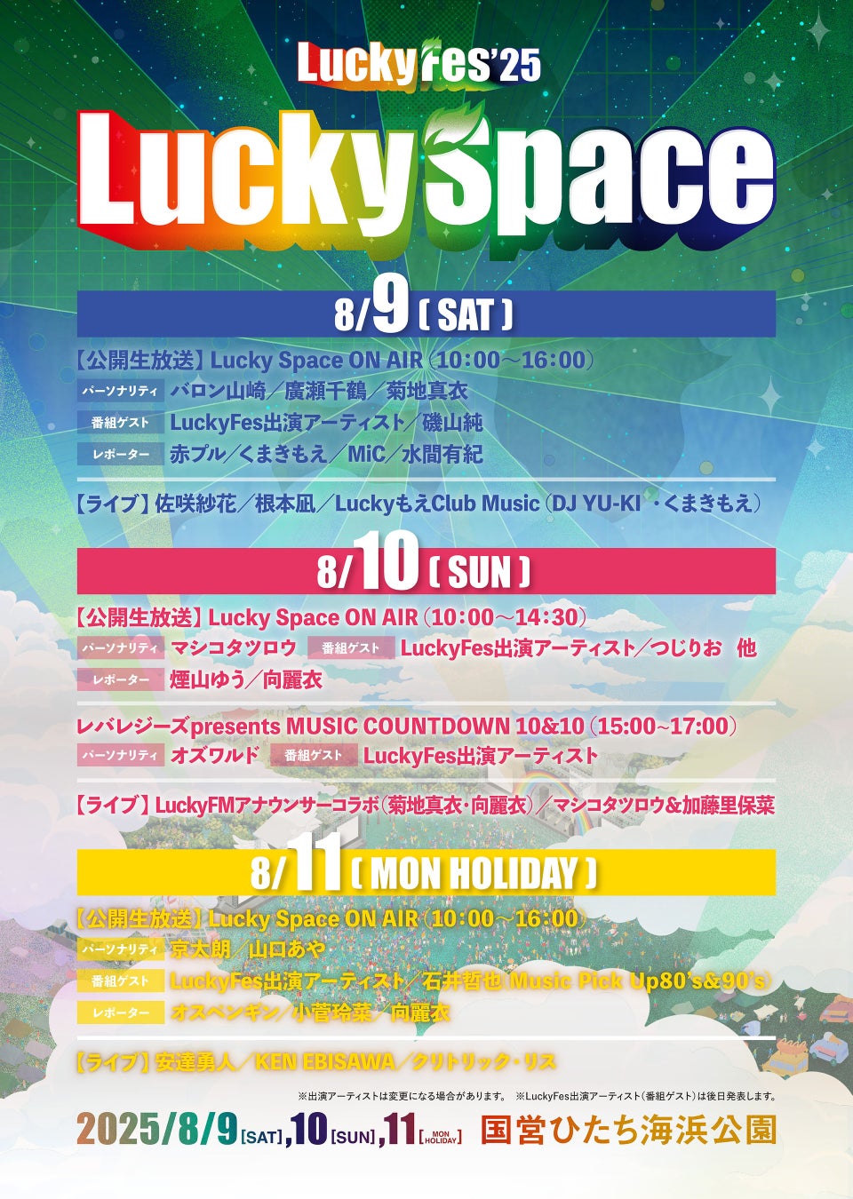 株式会社LuckyFM茨城放送(本社所在地:茨城県水戸市)は、8月9日(土)・10日(日)・11日(月・祝)の3連休に、国営ひたち海浜公園(茨城県ひたちなか市)で開催するLuckyFes'25の特設ステージ「Lucky Space」出演者とオープニングアクト8組が決まりましたのでお知らせします。