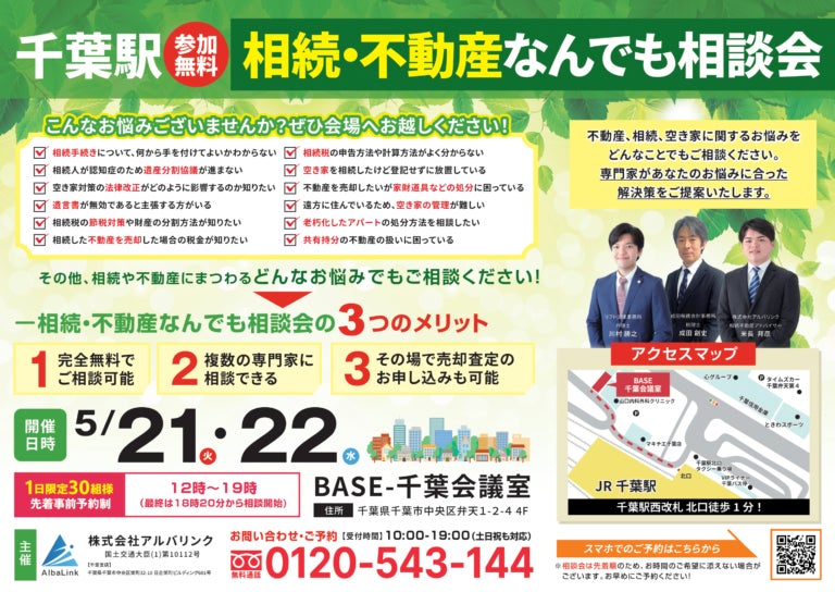 詳細は株式会社AlbaLinkコーポレートサイトにて公開。( https://albalink.co.jp/5%e6%9c%8821%e6%97%a5%ef%bc%88%e7%81%ab%ef%bc%89%e3%83%bb22%e6%97%a5%ef%bc%88%e6%b0%b4%ef%bc%89%e5%8d%83%e8%91%89%e9%a7%85%e9%96%8b%e5%82%ac-%e7%9b%b8%e7%b6%9a%e3%83%bb%e4%b8%8d%e5%8b%95%e7%94%a3/ )