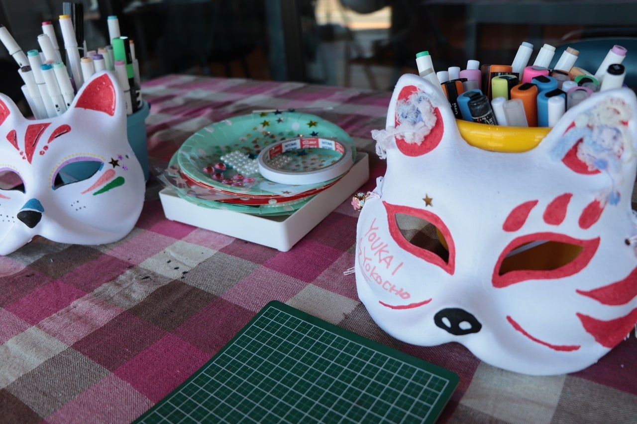「妖怪寺子屋」や「奇妙屋台」では、お面づくり体験やグッズ販売が行われ、作家の皆さんとの交流も楽しめます。
