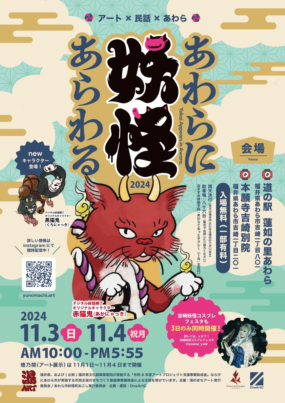 11月3日・4日、福井県あわら市吉崎で、イベント「あわらに妖怪あらわる」が開催されました。昨年に引き続き、2回目となる開催で、あわら市に伝わる2つの民話をもとに掛け合わせて誕生したオリジナルキャラクター「赤猫鬼(あかにゃっき)」をはじめ、さまざまな妖怪が会場に現れ、伝統とアートが融合した内容で多くの来場者を魅了しました。妖怪コスプレフェスタも同時開催され、地域の文化と魅力が市内外に広くアピールされました。