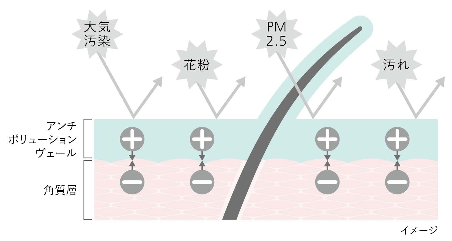 アンチポリューションヴェール*³は(+)、皮膚表面は(-)に帯電しているので、洗い流した後も頭皮や髪にしっかり密着。汚染物質*⁴の付着を防ぎうるおいを保持します。