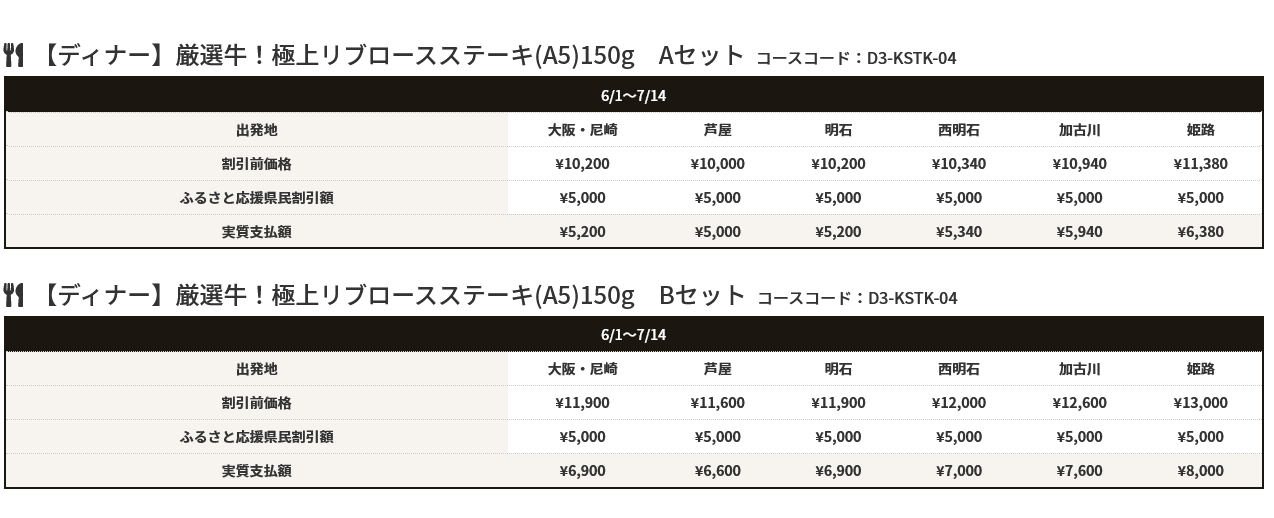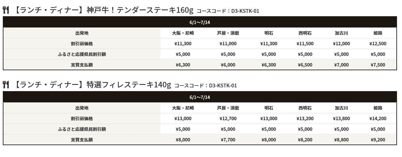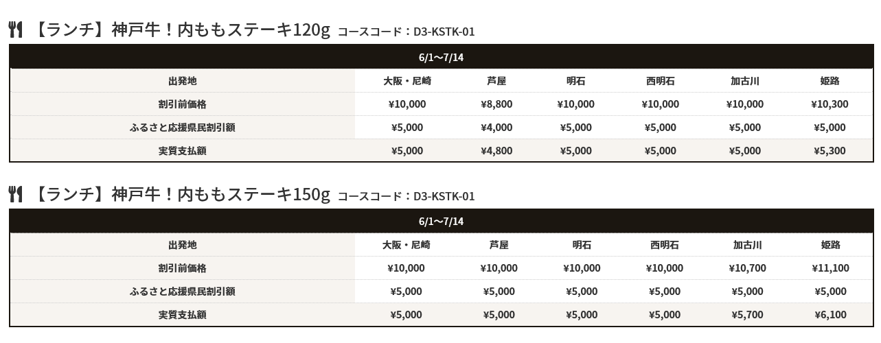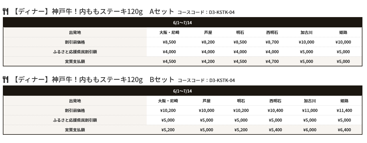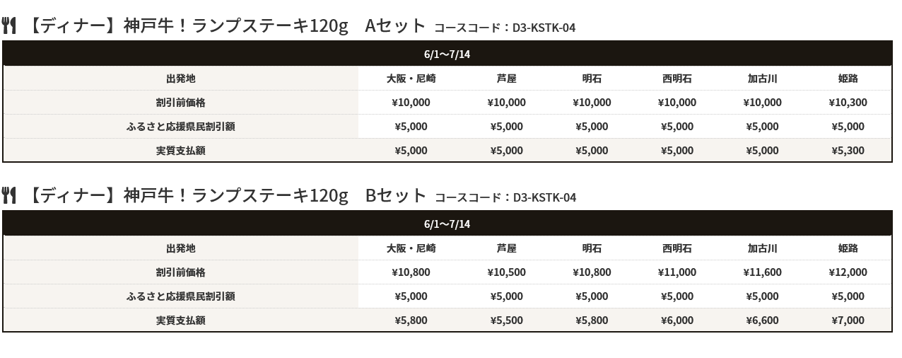 兵庫県内のステーキ店4店舗から選べるコースJR普通往復券とお食事がセットになったパックツアー♪ 兵庫を旅しようキャンペーン+を利用してお得にお食事が楽しめるプランです。※お申し込みは、2名以上からになります。
