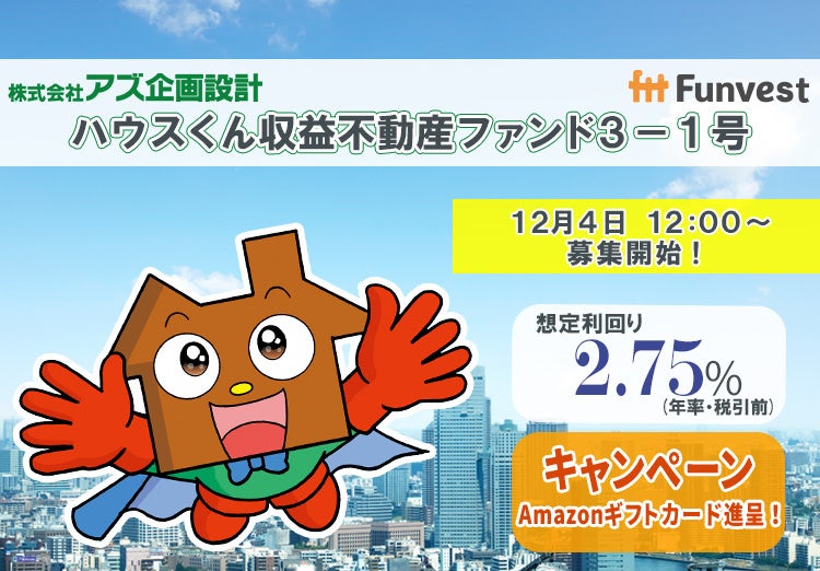 貸付型クラウドファンディング「Funvest」12/4より新ファンド「アズ企画設計 ハウスくん収益不動産ファンド3-1号」の募集を開始!