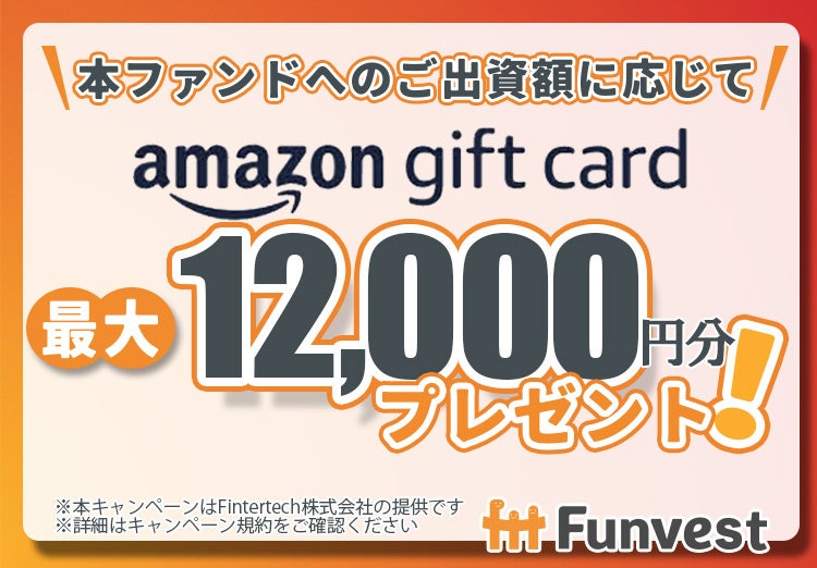 本ファンドへ出資していただいた投資家の皆様を対象として、出資額に応じて最大12,000円分のAmazonギフトカードをプレゼントするキャンペーンも併せて実施いたします。