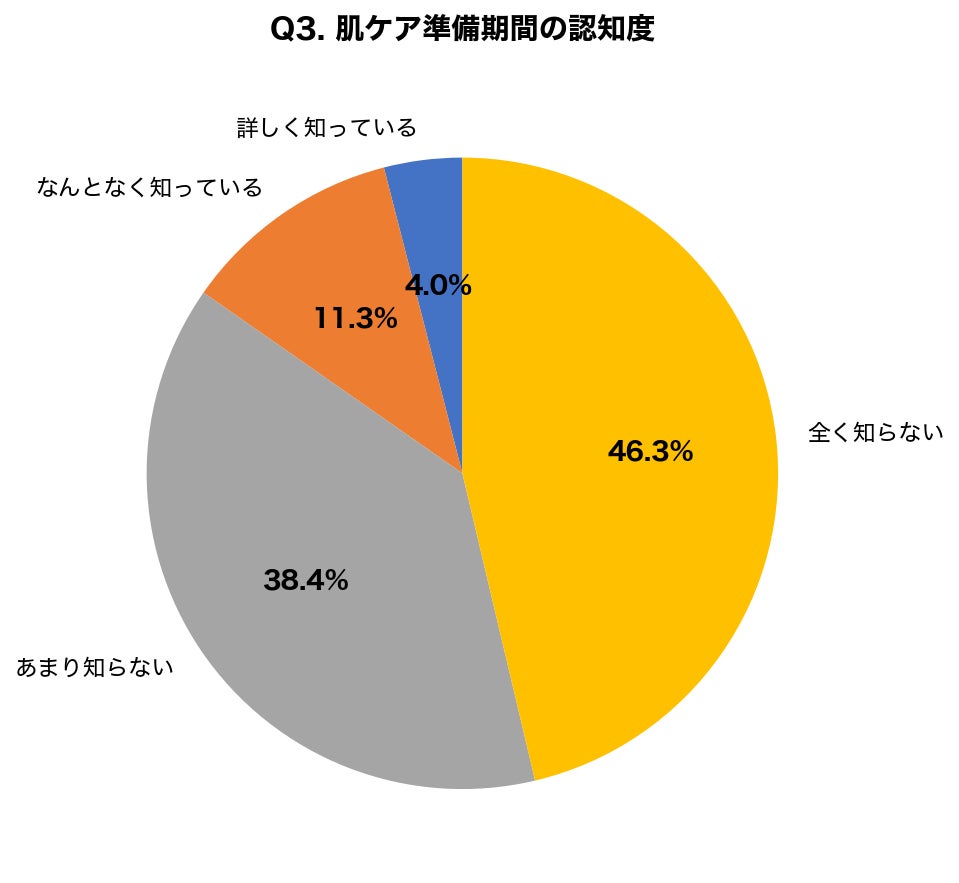 「あまり知らない」「全く知らない」を合わせると84.7%に達し、大多数が肌ケアの準備期間について正しい知識を持っていないことが判明しました。「詳しく知っている」と回答した人はわずか4.0%にとどまりました。