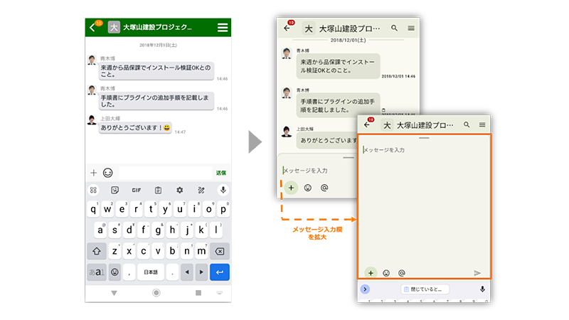 ルームやコンタクトでのチャット入力エリアを拡大できるようになり、ユーザーがテキストを入力しやすくなりました。