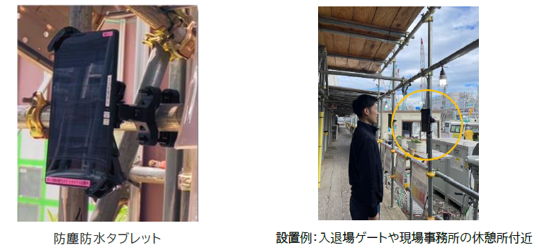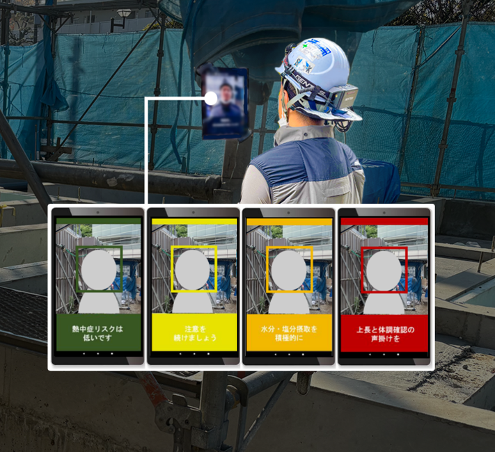 「カオカラ」は、顔や肌の研究開発実績に強みを持つメーカー、ポーラ化成工業と、ヘルスケア領域でのデータ分析・テクノロジー開発に強みを持つテック企業DUMSCOの共同開発で生まれた熱中症予防判定カメラです。タブレットで利用者の顔を撮影し、情報取得をすることで、熱中症リスクを4段階で判定・表示します。建設現場においては熱中症を予防することにより、労働者の負担を減らし、安全な現場運営が可能になります。