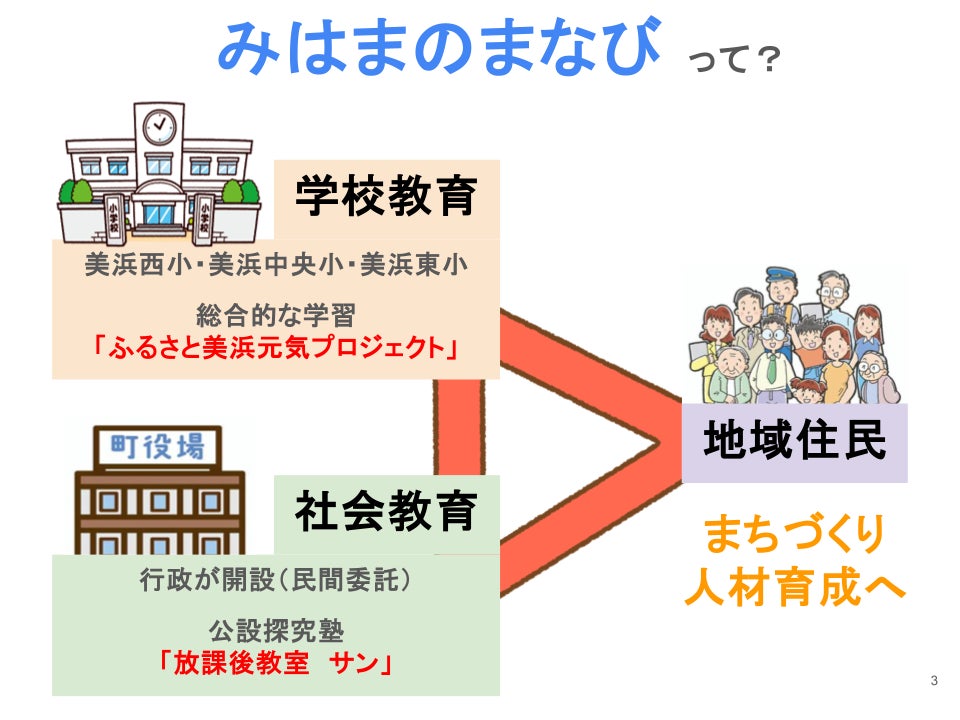 現在、美浜町では、放課後教室サンと学びコミュニティKaiなど、社会教育領域での事業を展開しています。