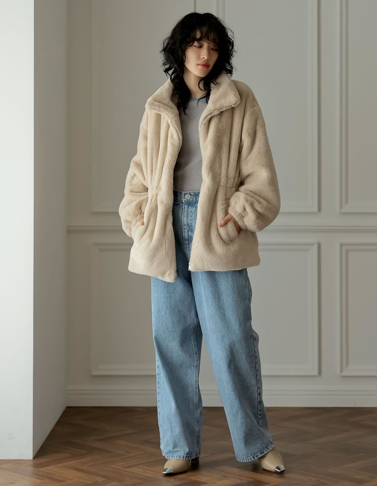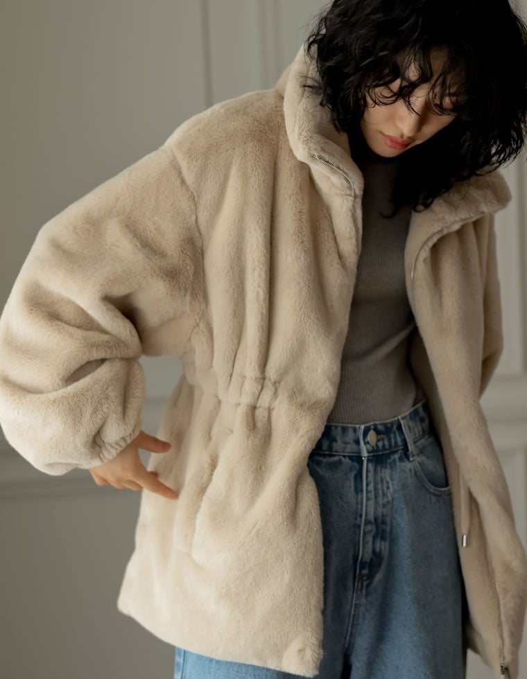 ふんわりと滑らかな質感で肌当たりの良いフェイクファージャケット。