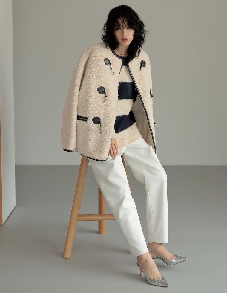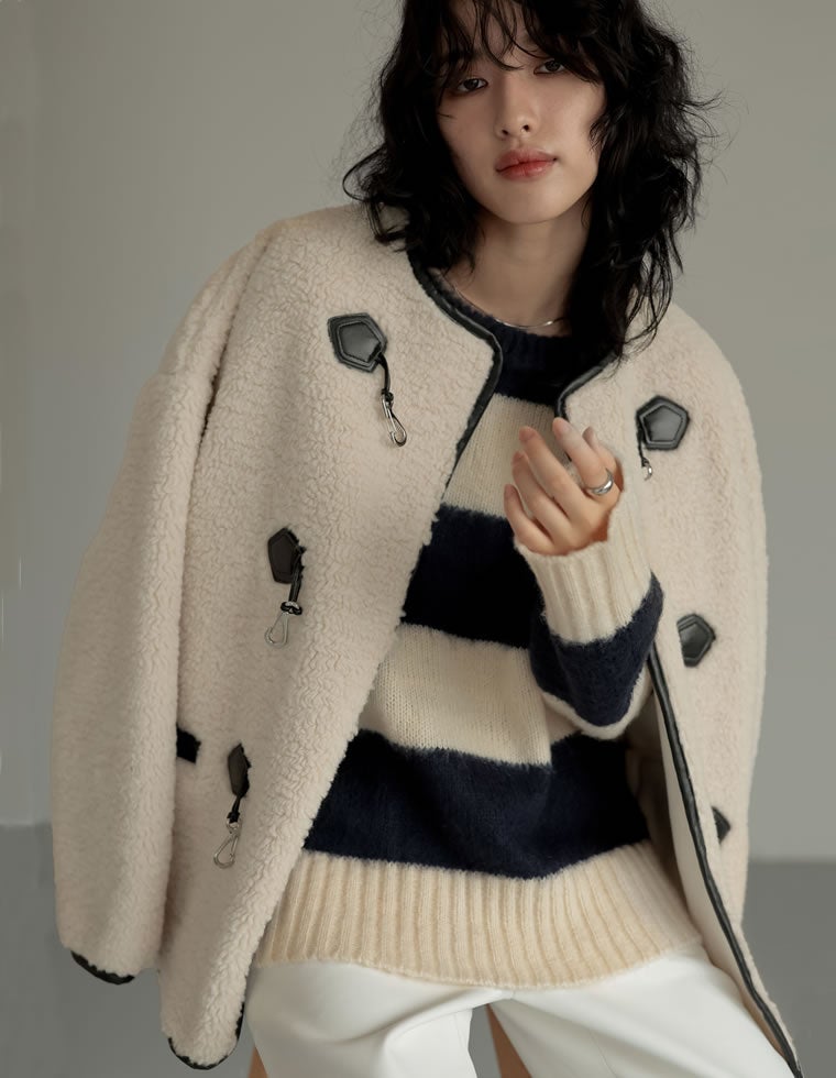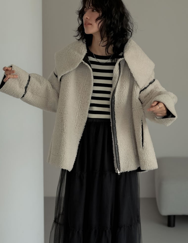 構築的なビッグカラーが印象的なパイピングボアコート。