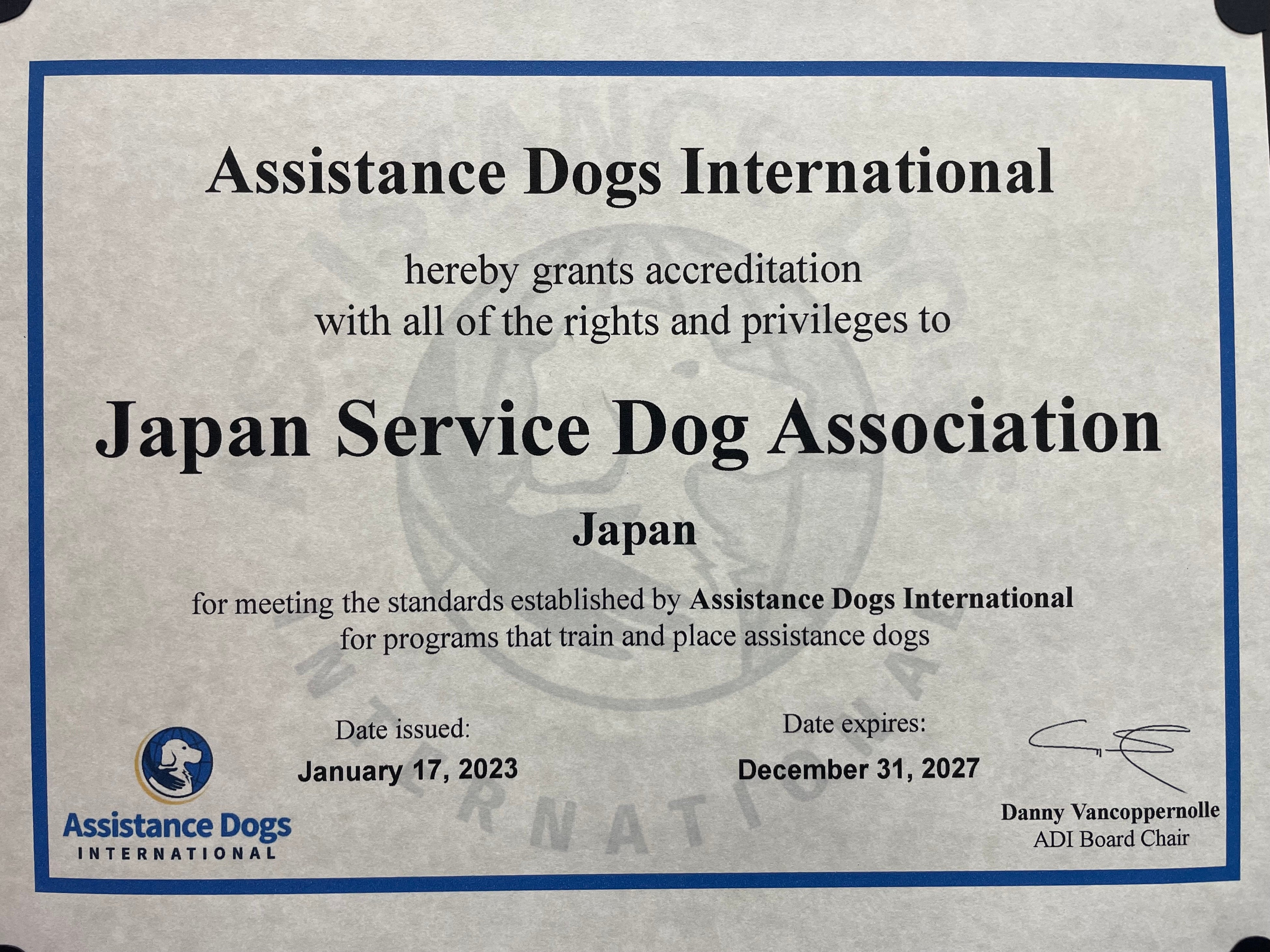 ADIとは、世界約30カ国 約150の非営利の補助犬の育成団体で構成される国際連合のこと。ADIの認可団体となるためには、書類審査を通過し、ADIから派遣される査察官による査察を受け、認定審査委員会にて承認を受ける必要がある。協会は2019年に書類審査を通過したが査察の直前にコロナ禍となり待機する事態となった。約3年の待機期間を経て2022年11月にイギリスからの査察官による3日間の査察を受け、2023年1月17日付けで認可団体として承認された。