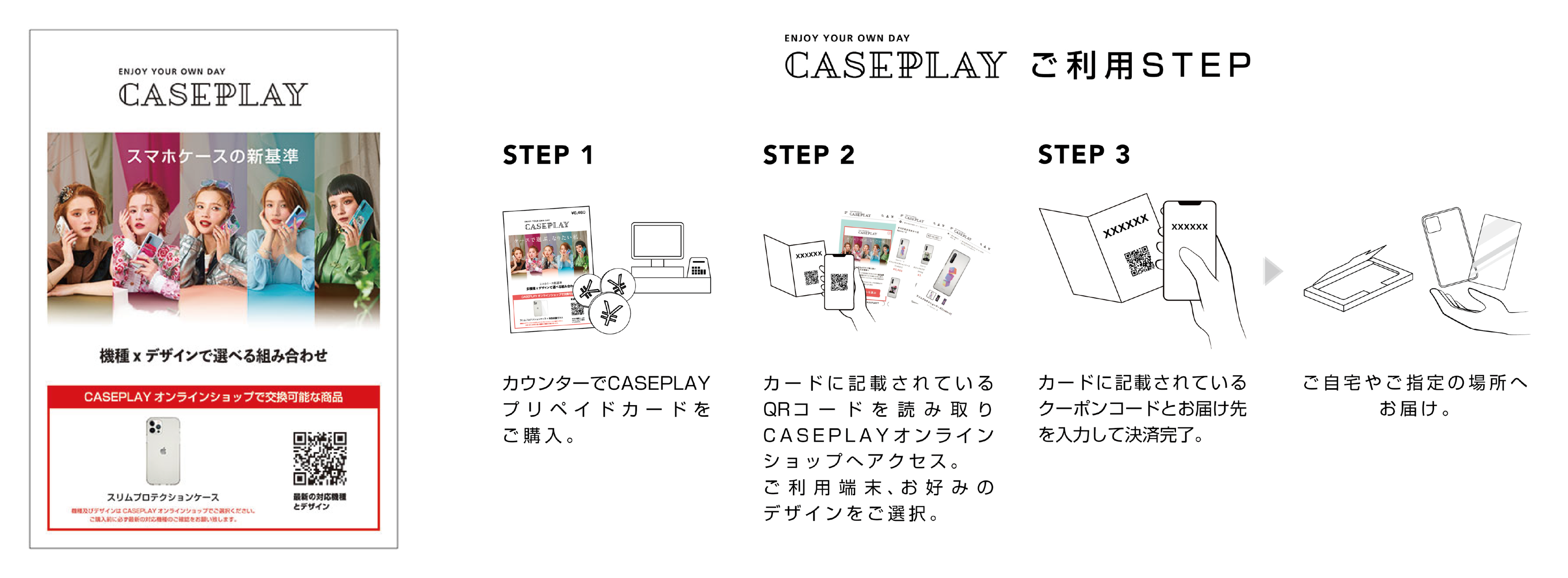 au Styleでは、オンラインストアCASEPLAY内でご利用いただける「CASEPLAYプリペイドカード [ スリムプロテクションケース ]」を販売いたします。ご購入頂いたプリペイドカードのQRコードからCASEPLAYサイトへアクセスしていただき、ご自身の機種とお好きなデザインをお選びください。ご指定の住所に選んでいただいたケースをお届けいたします。