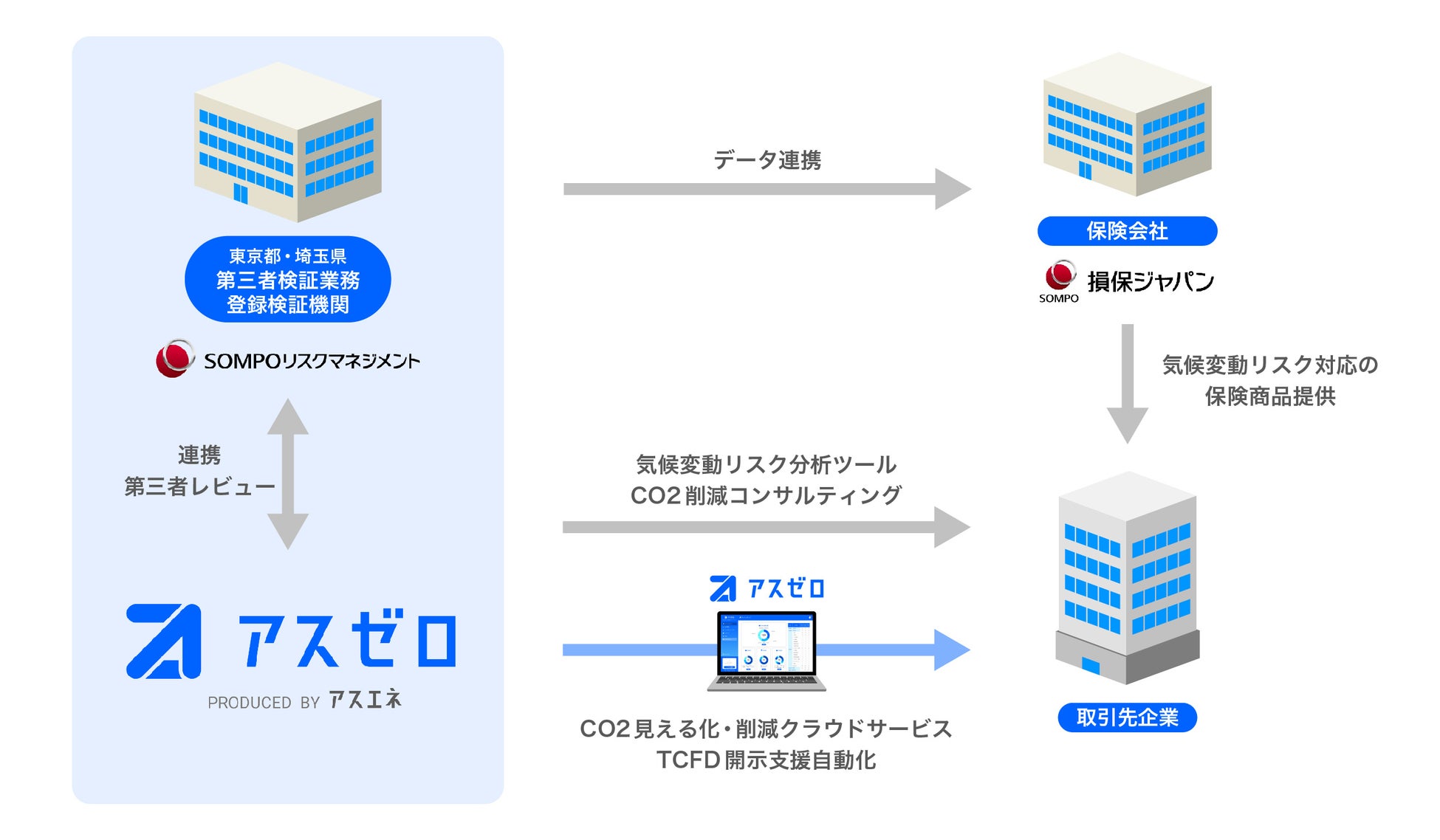 CO2排出量見える化・削減クラウドサービス「アスゼロ」を提供するアスエネ株式会社(本社:東京都港区、代表取締役CEO:西和田 浩平、以下「当社」)は、損害保険ジャパン株式会社(本社:東京都新宿区、代表取締役社長:白川 儀一、以下「損保ジャパン」)、SOMPOリスクマネジメント株式会社(本社:東京都新宿区、代表取締役社長:桜井 淳一、以下「SOMPOリスク」)と業務提携しました。SOMPOリスクマネジメントの気候変動リスク分析ツールとアスゼロのデータ連携を通じて、気候変動リスクの定量化、温室効果ガス排出量算定の第三者レビューを行います。