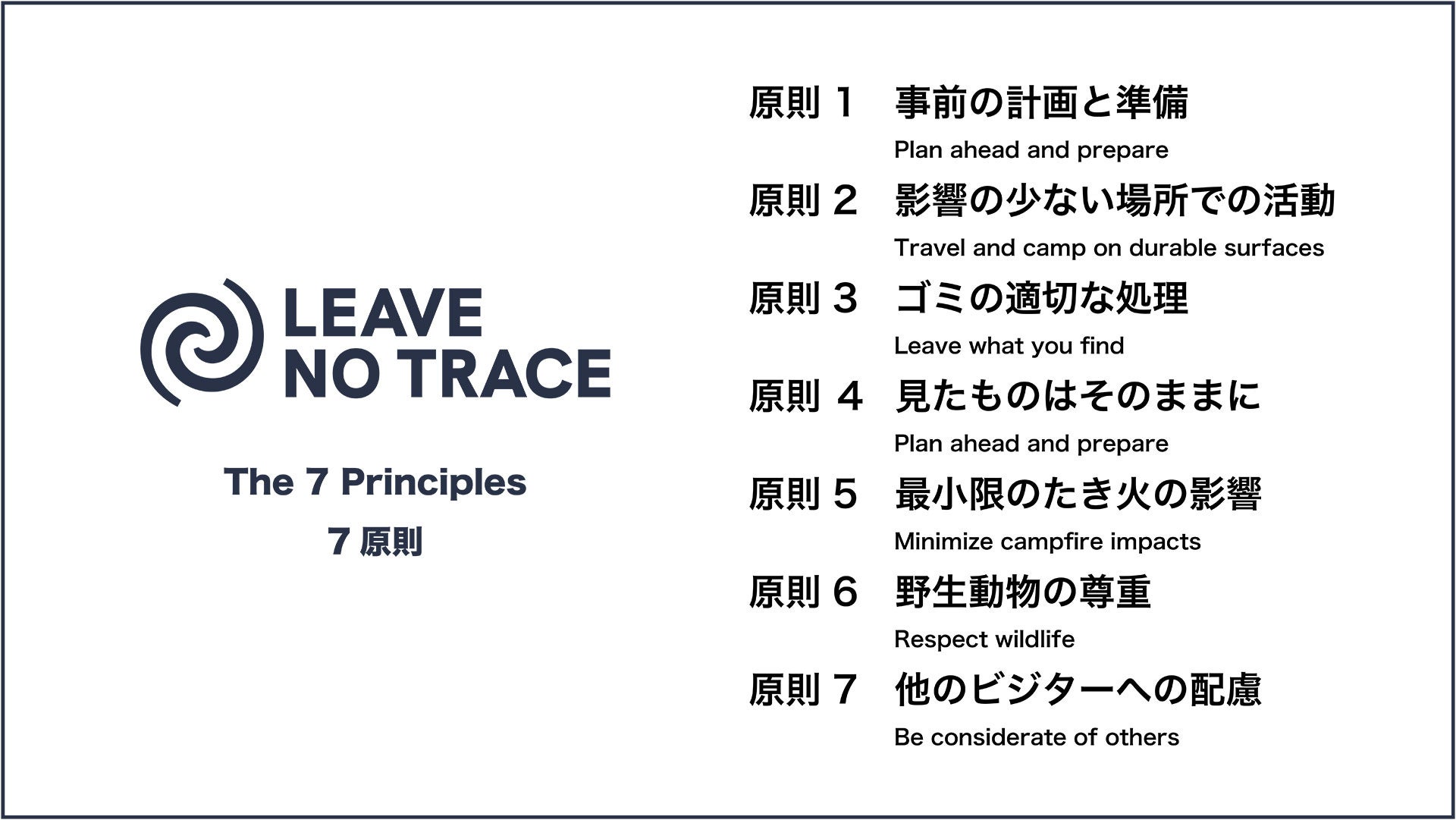 LEAVE NO TRACE(リーブ ノー トレイス)は、環境に対するインパクトを最小限にして、アウトドアを楽しむための環境倫理プログラムです。すべてのテクニックが7つの原則を基にしており、誰にでもわかりやすく、楽しく実践することができます。