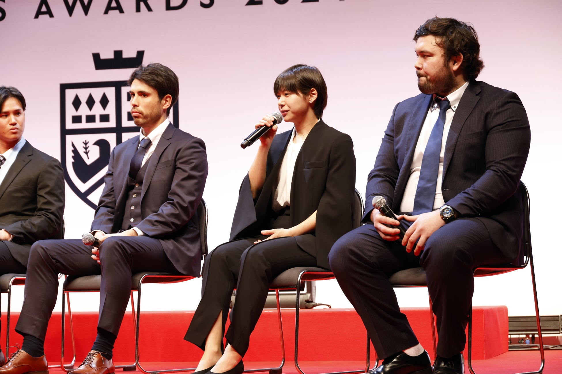 「パラアスリート・オブ・ザ・イヤー」の表彰では、土井氏が登壇し、「学生のうちからデュアルキャリア形成についてしっかりと考え、行動することが人生を多角的に豊かにすると考えています。そこに気づきを与えるきっかけとなり得る式典に携われてすごく光栄に思います。」と受賞者へコメントしました。「ウーマン・オブ・ザ・イヤー」の表彰では宮脇選手が登壇し、「学生の時から、日本の大学スポーツのポテンシャルはもっともっとあるのではないかと思っていました。大学卒業から何年も経ち、今はプレゼンターという立場ですが、このような素晴らしい表彰式のお手伝いができて大変嬉しいです。」とコメント。「マン・オブ・ザ・イヤー」の表彰では、ウルフ選手が登壇し、「この受賞を力に変えて、これから先も長い人生ですが、頑張っていってもらえたら。」と未来のアスリートへ向けて、エールを送りました。