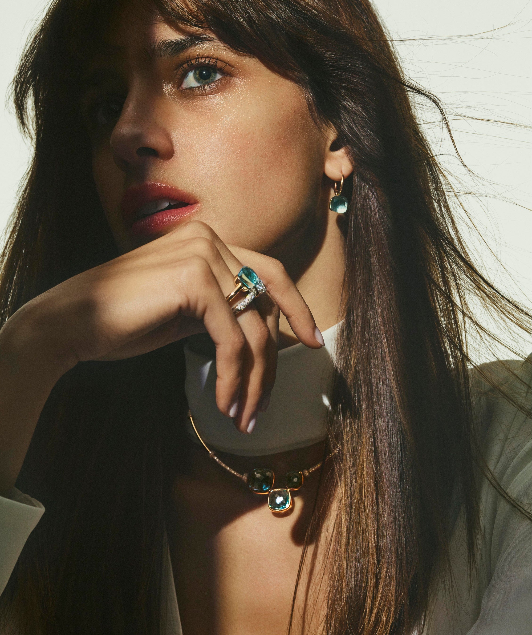 若く才能豊かな女優ベネデッタ・ポルカローリは、イタリア映画界の新星です。彼女は評価の高い映画の主演であることも多く、強さと確固たる意志を持ち合わせています。新時代のロールモデルであるベネデッタ・ポルカローリは、ファッショナブルでシックなスタイルに加え、強い個性と人生に対する新鮮な視点を、フォトグラファーであるグレゴリー・ハリスのレンズを通して力強く表現しています。ローズゴールドにダイヤモンドがあしらわれた「イコニカ」コレクションの新作ネックレスには、彼女自身が選んだバングルやリングを合わせています。他にも、「ヌード」からはスカイブルートパーズのペンダントやイヤリング、そしてリングのパリュールをまとい、昼も夜も日々気軽に着用しやすいというコレクションの魅力を表しています。