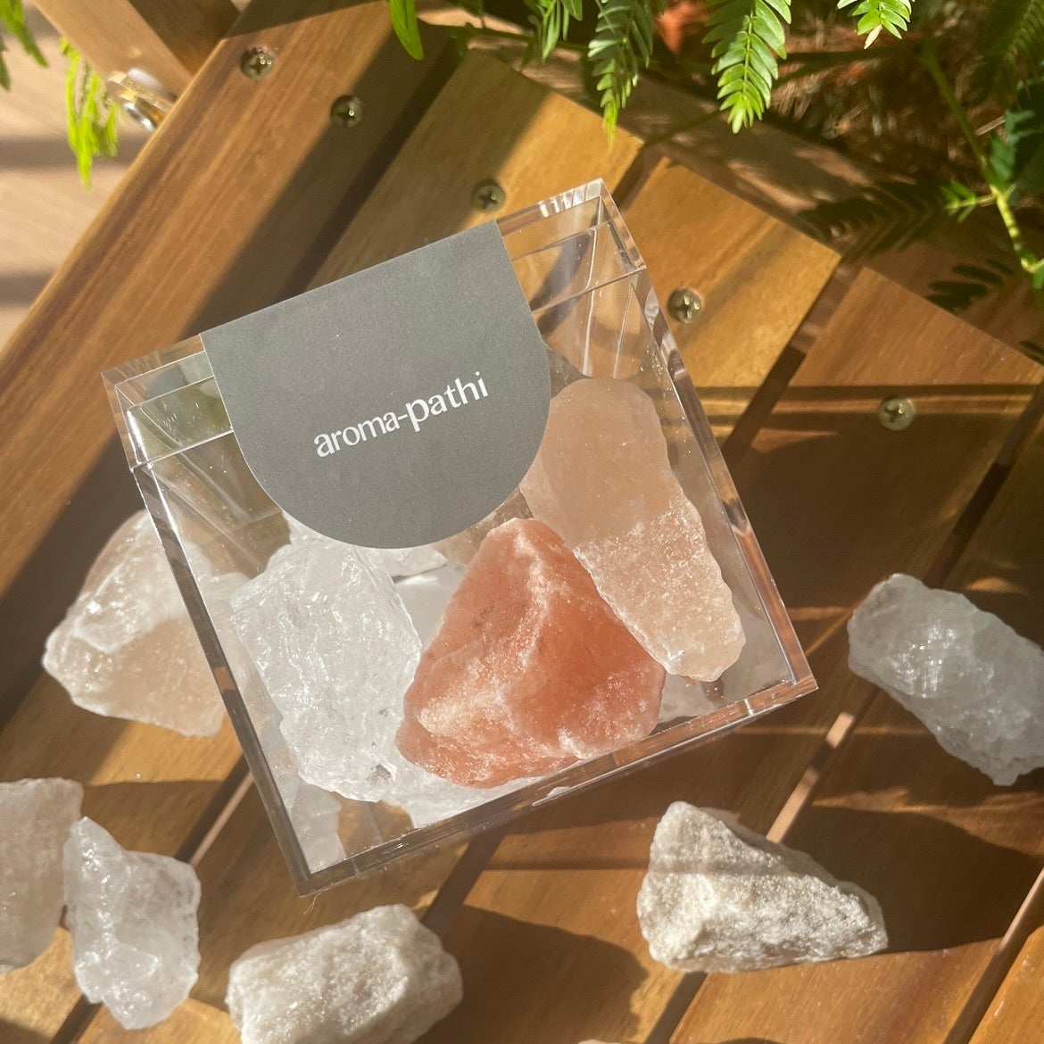 クリアボックスに入った4色のソルトは目にも美しく、ギフトに最適です。アロマストーン・インテリアとしてもおすすめ。