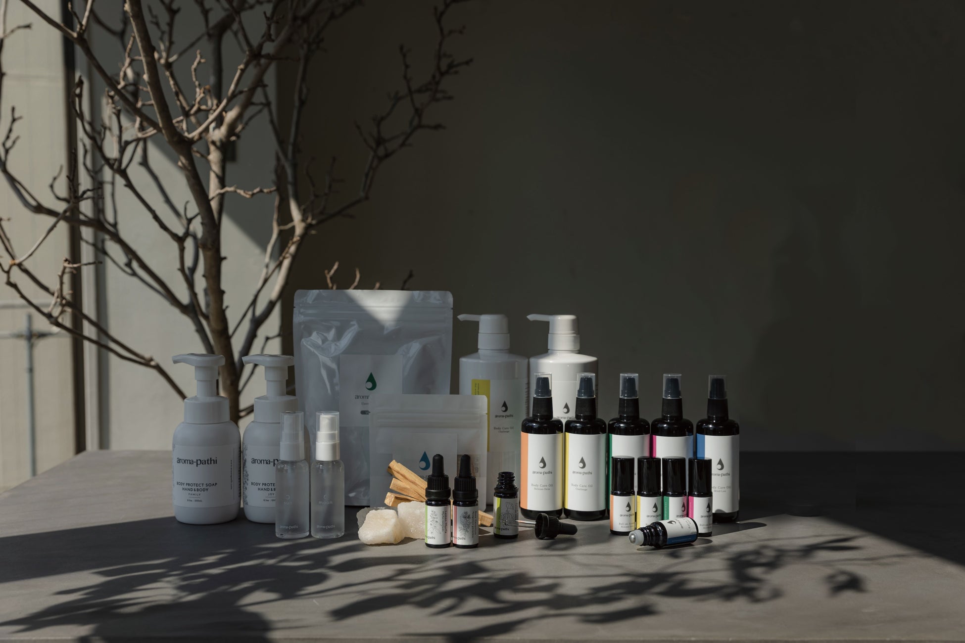 3つの自然療法を組み合わせたボディケアブランド「aroma-pathi(アロマパシィー)」を始めとしたアロマスプレー・ロールオン・バスソルトなどを一堂にご紹介。