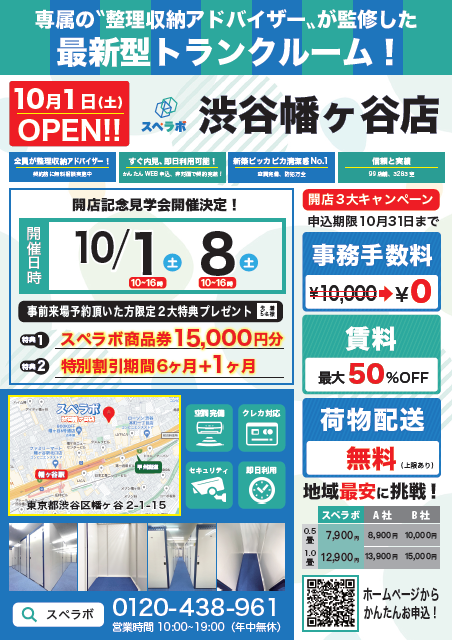 【10月1日(土)オープン】見学から契約、解約まで完全非接触・非対面、お申し込みからご利用まで最短1時間!都内にて絶賛運営中のトランクルーム【スペラボ】が渋谷区幡ヶ谷に出店!