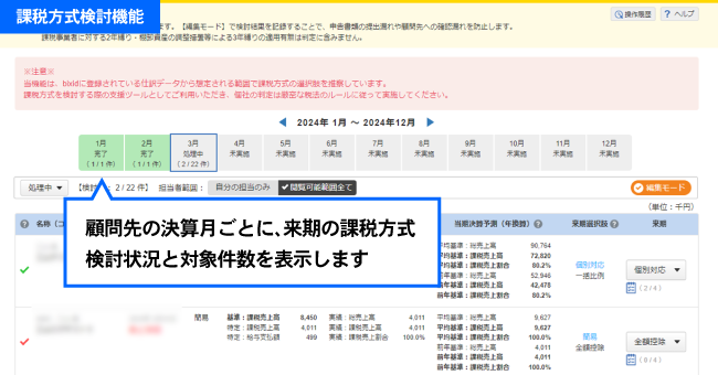 これまで「課税方式検討機能」では、決算月を迎える顧問先をリストアップし、bixid(ビサイド)上の会計データを用いて来期の課税方式を判定・管理することが可能でした。