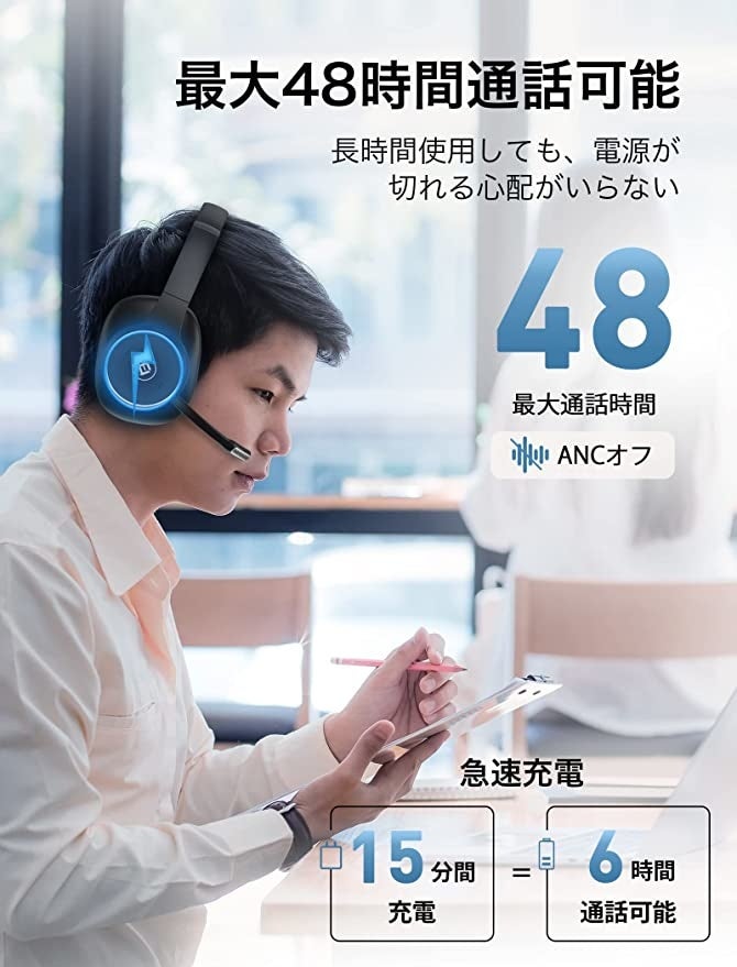 EMEETヘッドセット HS150は、USB接続がもちろん、Bluetooth5.0とドングルで安定的で快適なワイヤレス接続ができ、PC、デスクトップ、タブレット、携帯電話など様々なデバイスで利用可能である。Bluetoothの場合、2台のデバイスと同時に接続でき、簡単に切り替えることもできる。また、EMEETヘッドホンは大容量バッテリーが内蔵されているため、最大48時間通話利用可能である。さらに、1.5h充電した後、最大6時間の使用が可能ので、電源が切れる心配がいらなく、通勤や出張にも活躍できる。