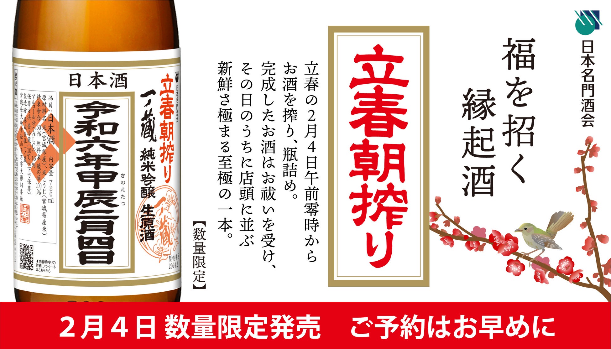 立春朝搾りは日本名門酒会が1998年(平成10年)に企画した春の祝い酒で、一ノ蔵は2005年(平成17年)から参加し今回で20回目を迎えます。