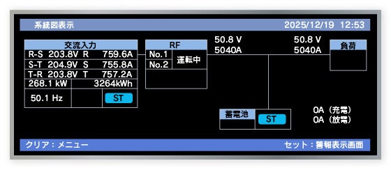 系統図を模したLCD画面で入力電力や電圧電流などを確認できます。