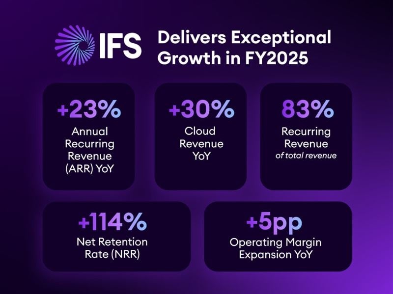 2026年1月22日、英国ロンドン – 産業用AIソフトウェアのリーディングプロバイダーであるIFSは本日、2025年12月31日を期末とする2025年度(FY2025)の通期決算を発表しました。産業用AIが実証・試験段階から本格的な業務展開フェーズへと移行する中、ARR(年間経常収益)は前年比23%増、利益率は大幅に拡大し、顧客数も増加しています。