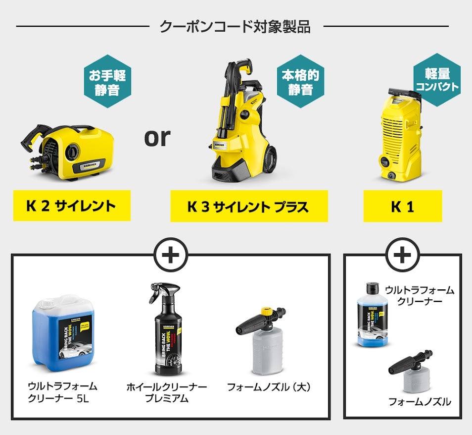 高圧洗浄機(対象品)と、ウルトラフォームクリーナー5L、ホイールクリーナープレミアム、洗浄剤を泡状に塗布できるアクセサリーフォームノズル(大)の特別セット(クーポン利用時)
