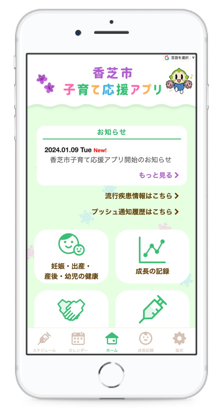 香芝市の子どもたちや子育てを応援したいという想いを込めて「香芝市子育て応援アプリ」と命名しました。トップページには、香芝市のマスコットキャラクター「カッシー」や香芝市の花「すみれ」が登場。香芝市らしさが詰まった こだわりのデザインでお届けします。