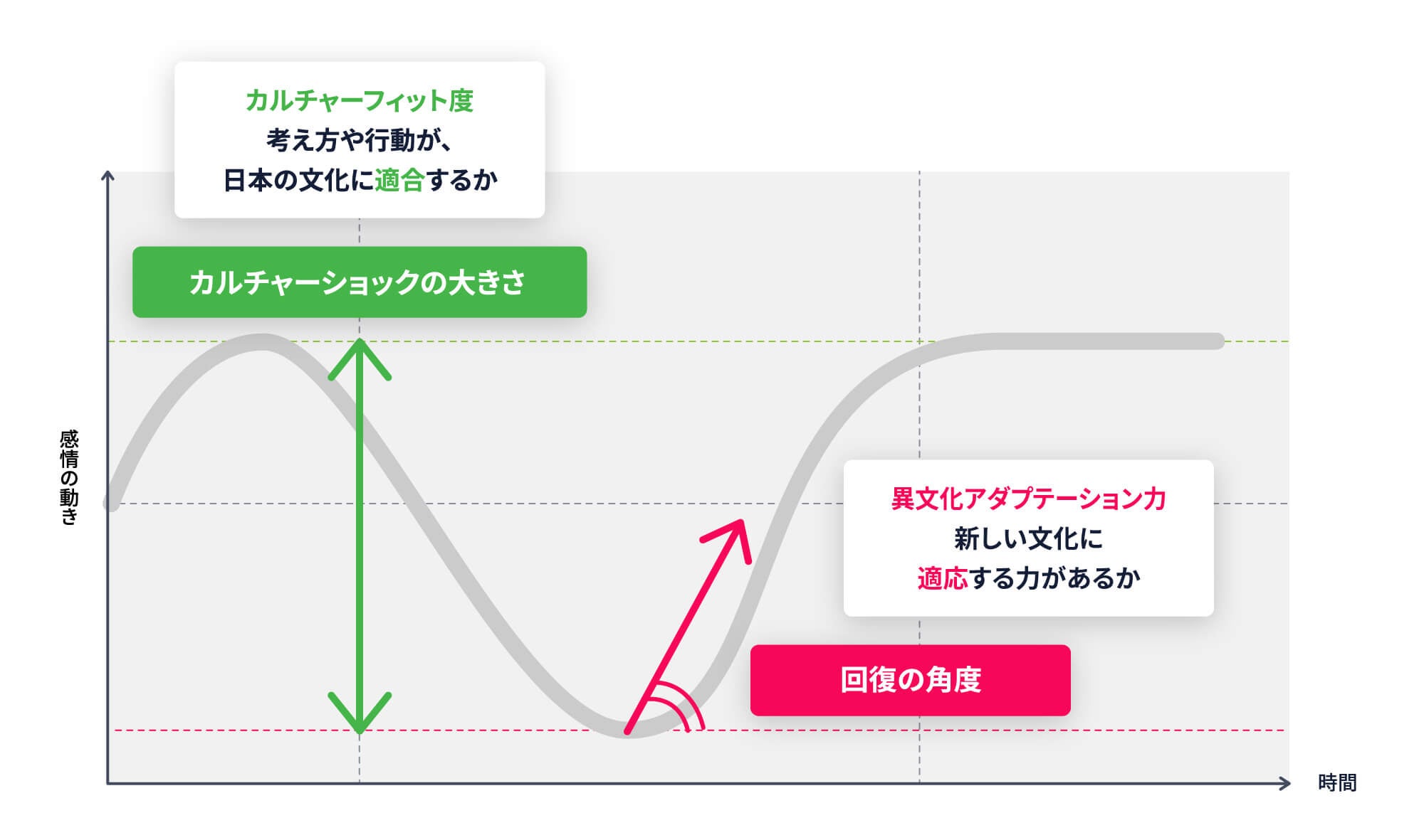 このCQが高い外国人材は、カルチャーショックからの回復スピードが非常に速いことがわかっています。つまり、定着する外国人材を見極めるポイントとして、「CQの高い外国人材」、さらに「自社のカルチャーに合う外国人材」を意識する必要があります。