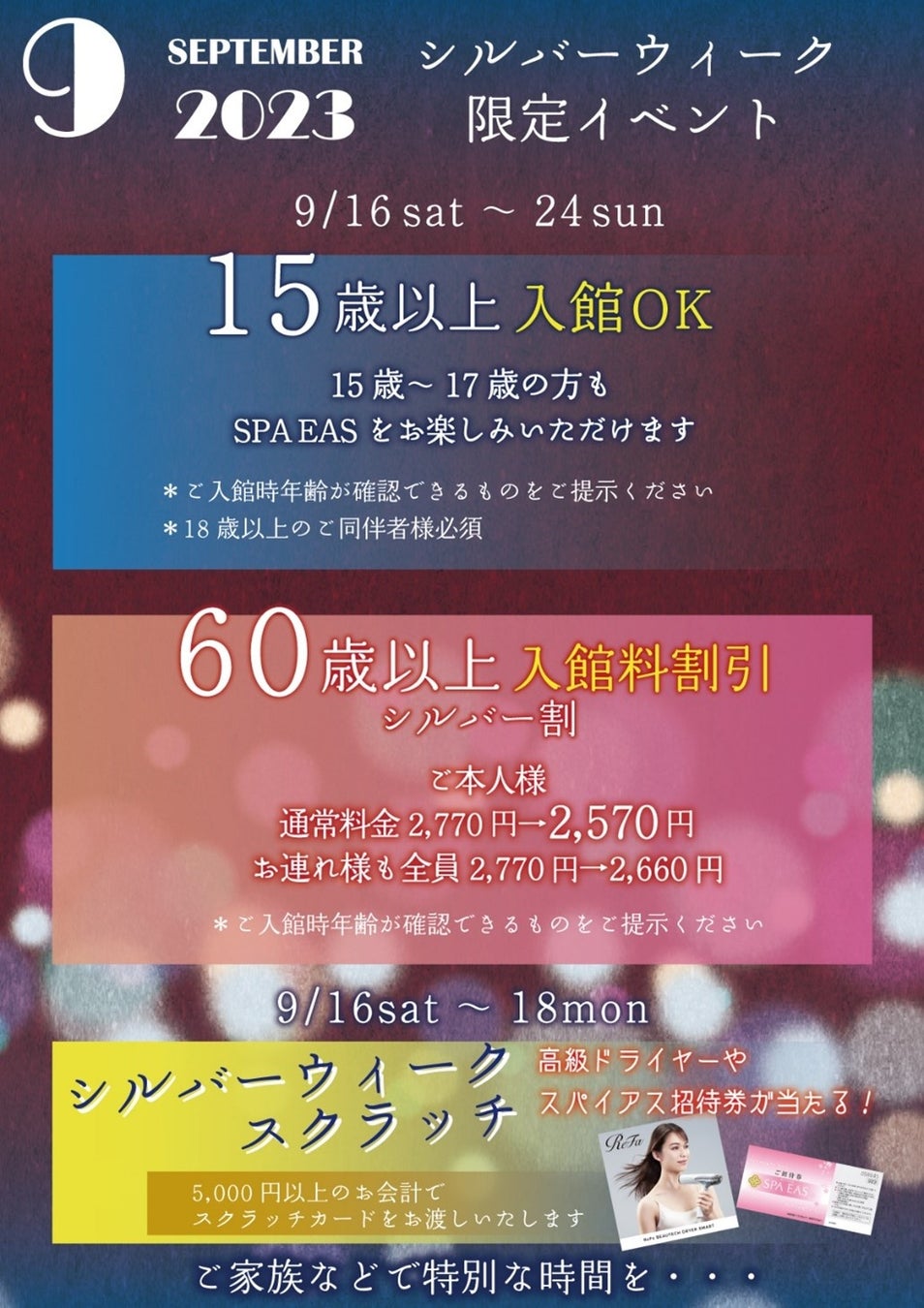 普段は18歳以上の大人のスパ施設をコンセプトに営業しておりますが、豊かなまちづくりと地域活性化の一環として、シルバーウィークにぜひ3世代でご利用いただきたく、60歳以上の方へ特別価格でのご案内と、15~17歳の方もご利用いただける特別な期間をご用意いたします。