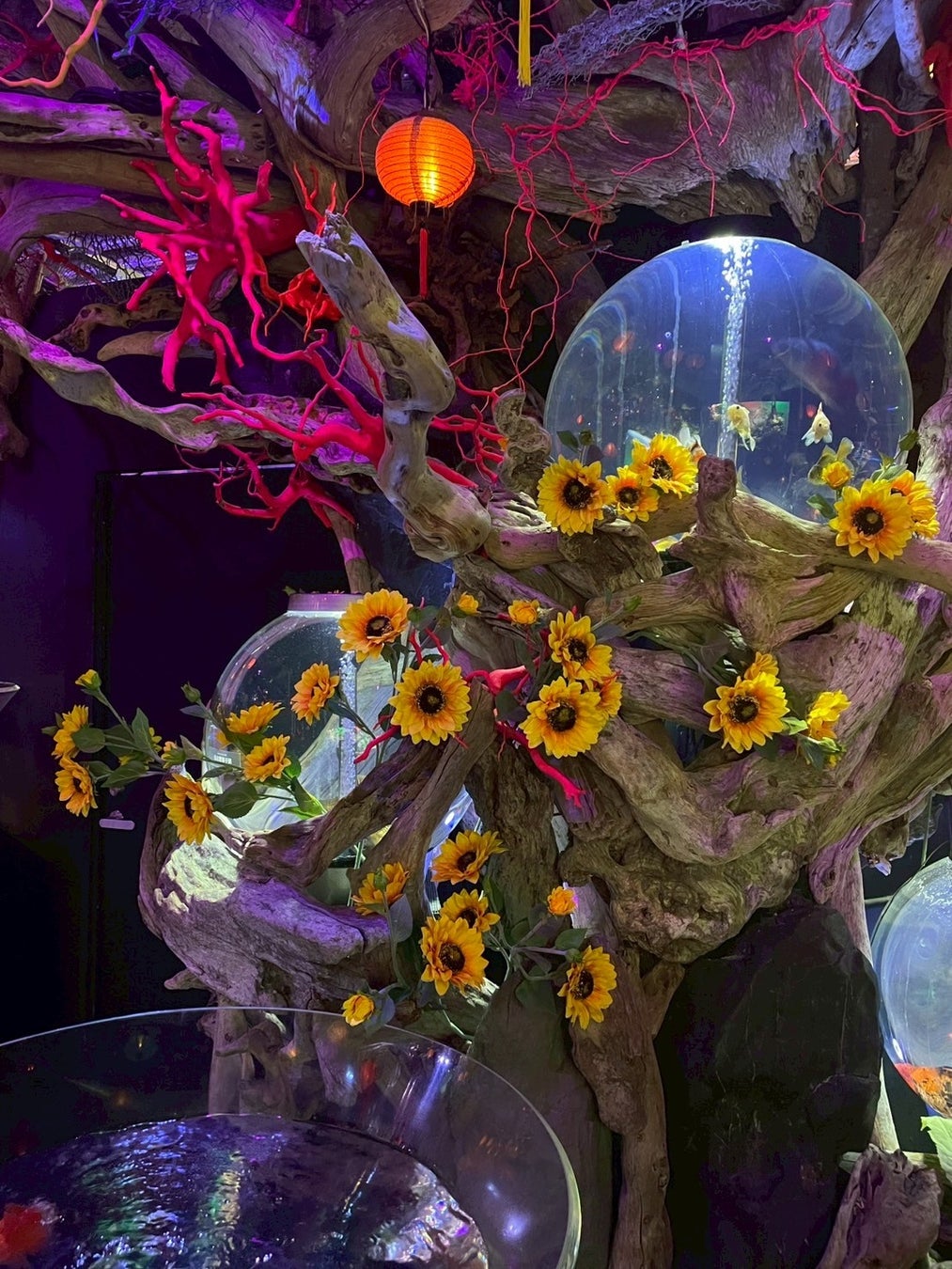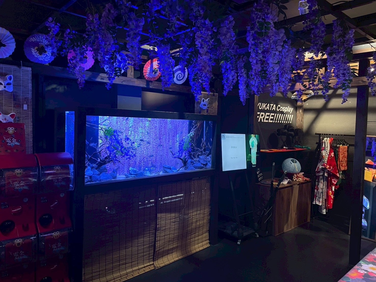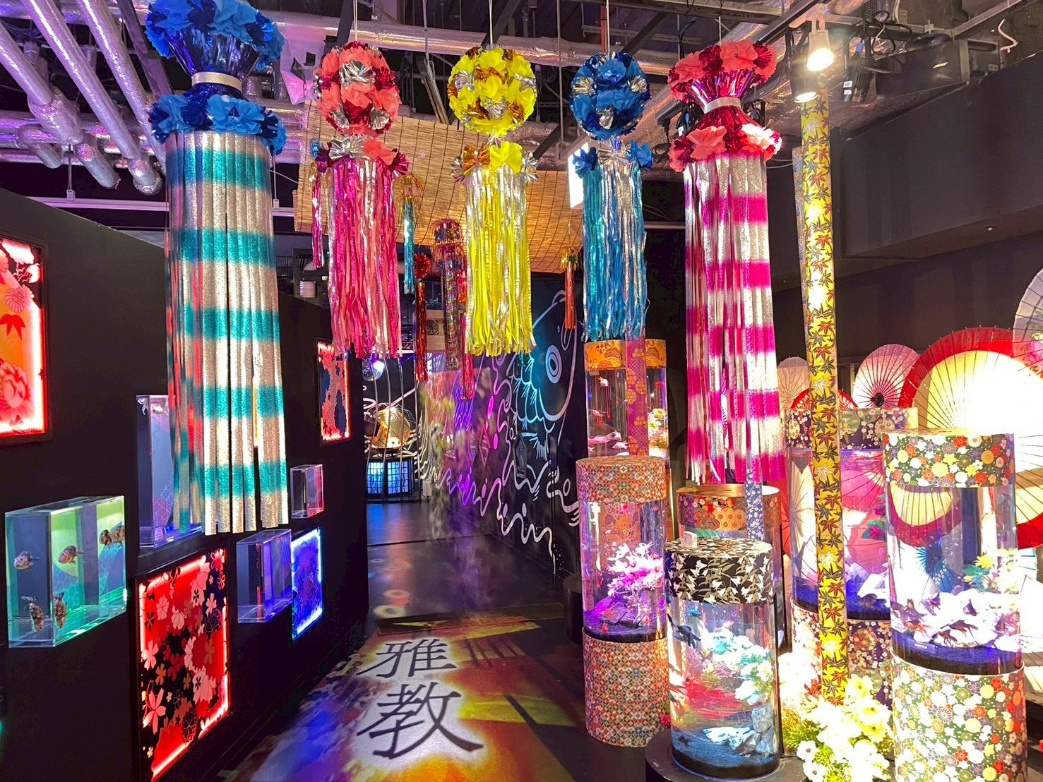 入り口では藤とひまわりの花々が来場者を出迎え、館内では天井から吊るされた七夕飾りや短冊が幻想的な空間を創出。夏の夜空を思わせるライトアップとともに、金魚がゆらめく水槽が訪れる人々を涼やかに包み込みます。