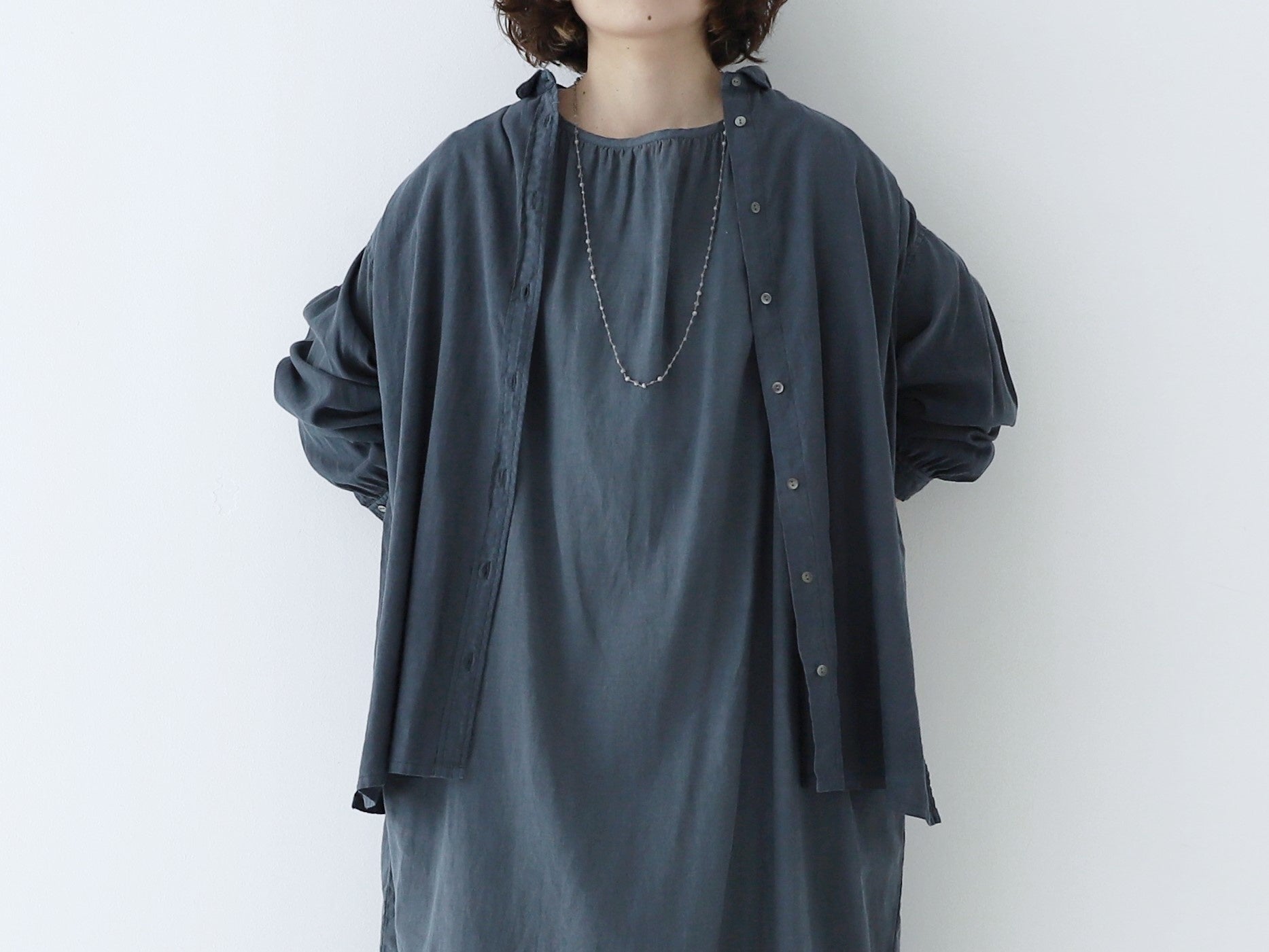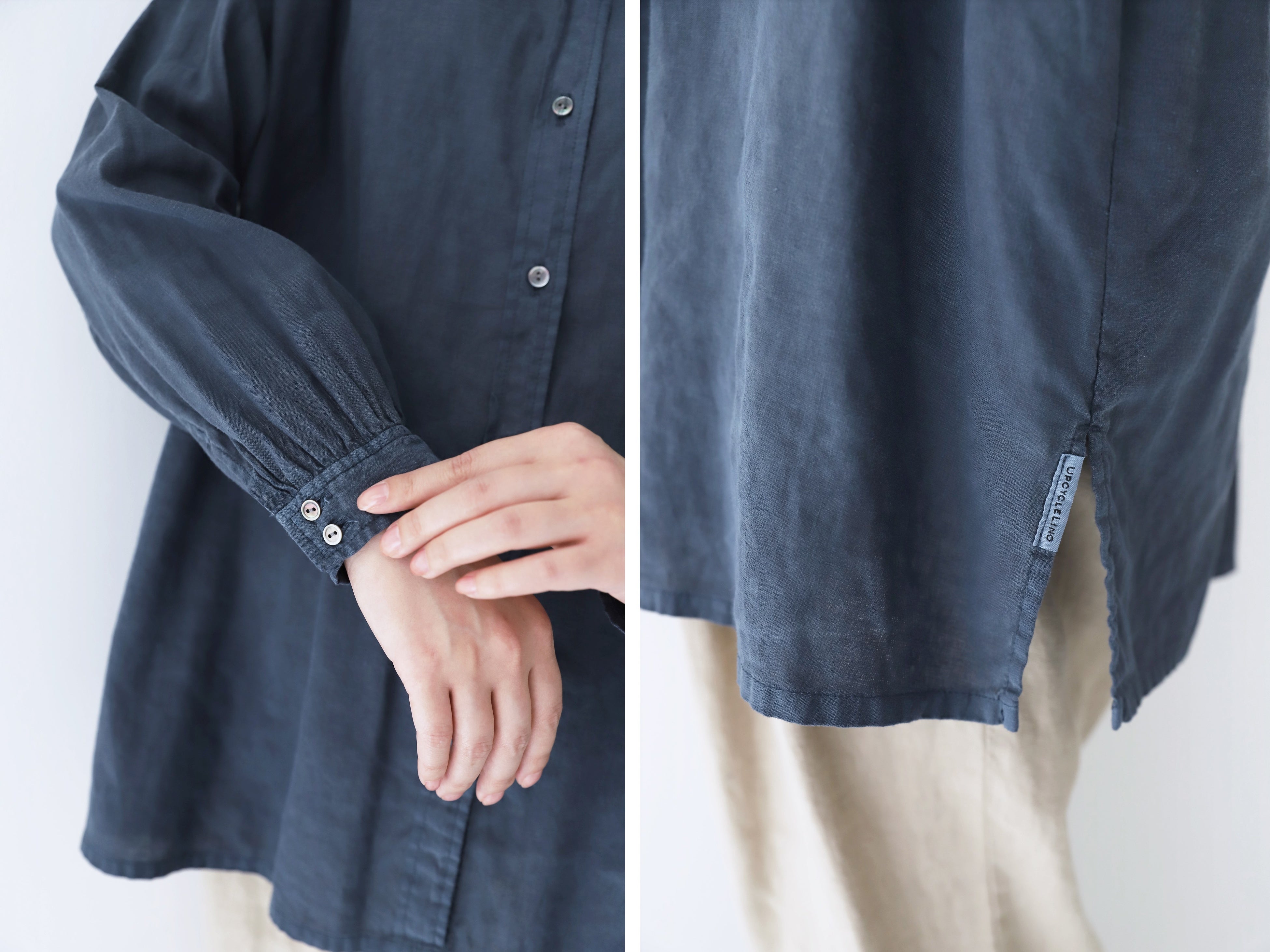 メンズのディテールを取り入れたシンプルなシャツブラウス。小さな丸衿でレディなエッセンスをプラス。ピグメント染めを採用し、ヴィンテージのような独特のムラ感を表現しました。