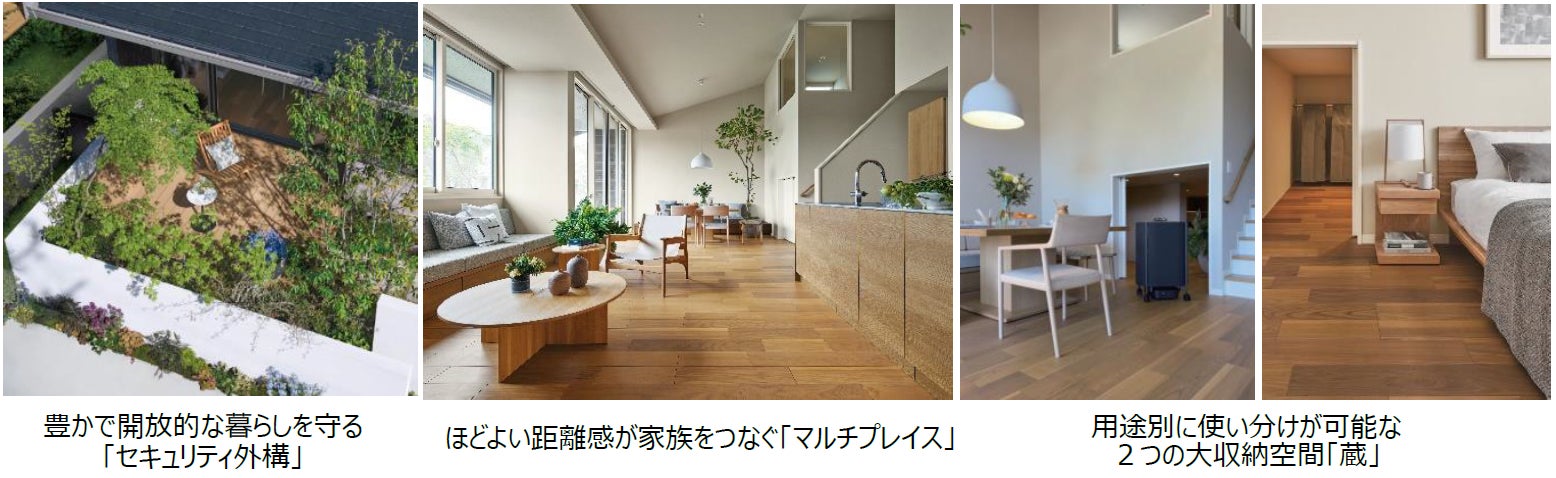 おおらかに庭とつながる平屋形態をいかし、自然豊かな子育て環境を実現します。ほどよい高さの塀や植栽の連続によって防犯性を高めた「セキュリティ外構」は、子どもの飛び出しを防止しながら居心地のよいアウトリビングを構成し、自然と触れ合いながら安心して過ごすことが可能です。家族それぞれが仕事や趣味に集中できる居場所を、家の内外に複数設けた「マルチプレイス」が家族のほどよい距離感を実現します。