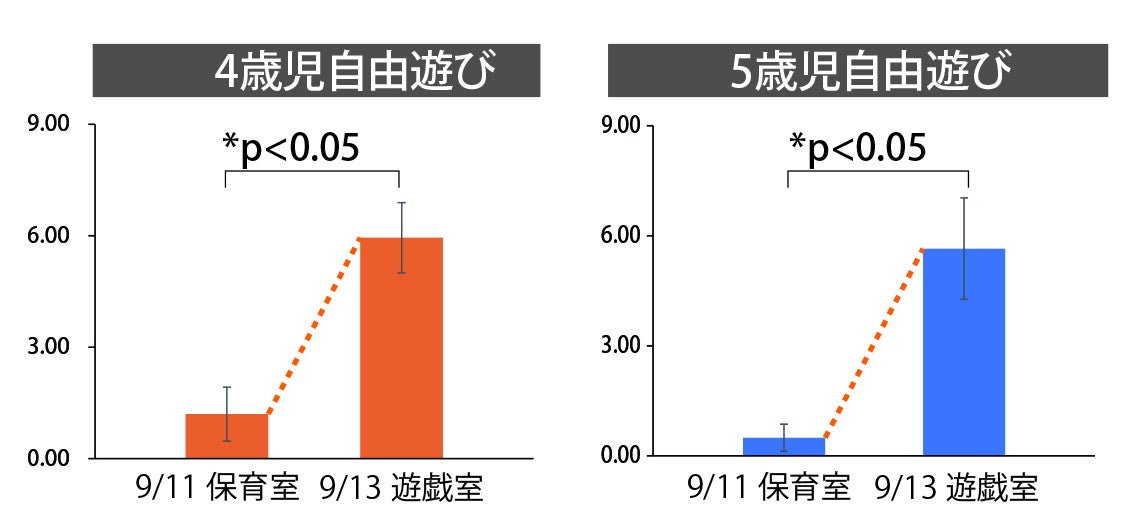 改善策の実施前後で終日活動量を比較した結果、歩行数、中・高強度活動※3長さについて、5歳児クラスは歩行数、中・高強度活動共に、実施後の方が有意に多い結果になりました。※4 さらに遊戯室、保育室のそれぞれで実施した室内自由遊び時の活動量と子どもの様子を比較したところ、中・高強度活動長さ(平均値、10分換算)は遊戯室の方が有意に長く、遊びの内容も上肢を多く使うなど改善されたことがわかりました。